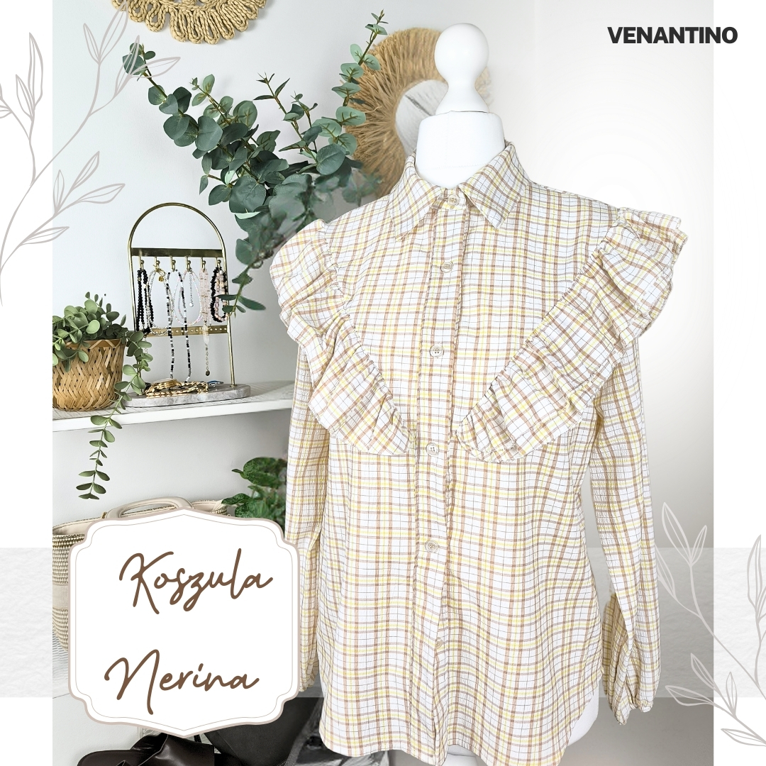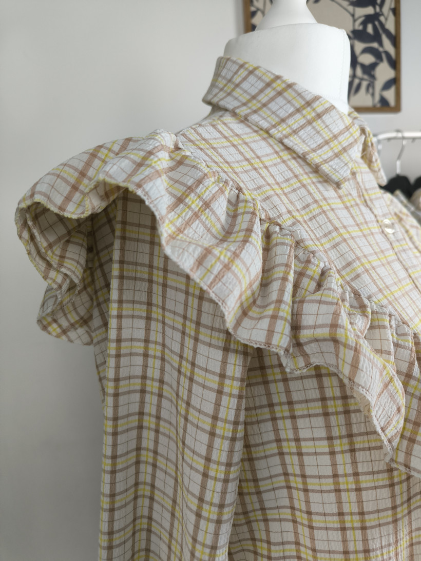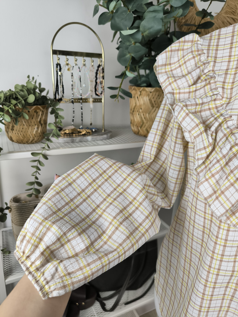 Miękka kratka w ciepłych, wiosennych tonach, pięknie układająca się falbana i lekko bufiaste rękawy tworzą całość, która wygląda szlachetnie i bardzo kobieco.
