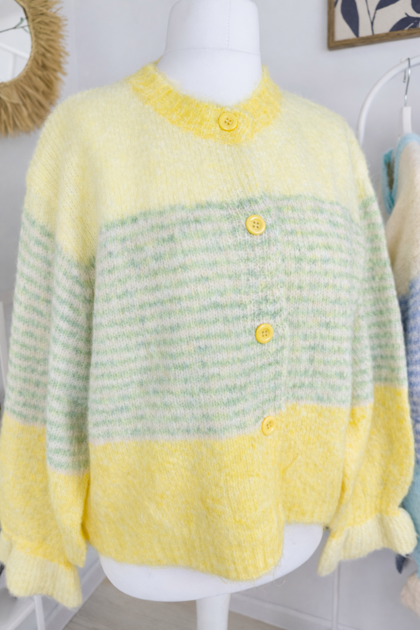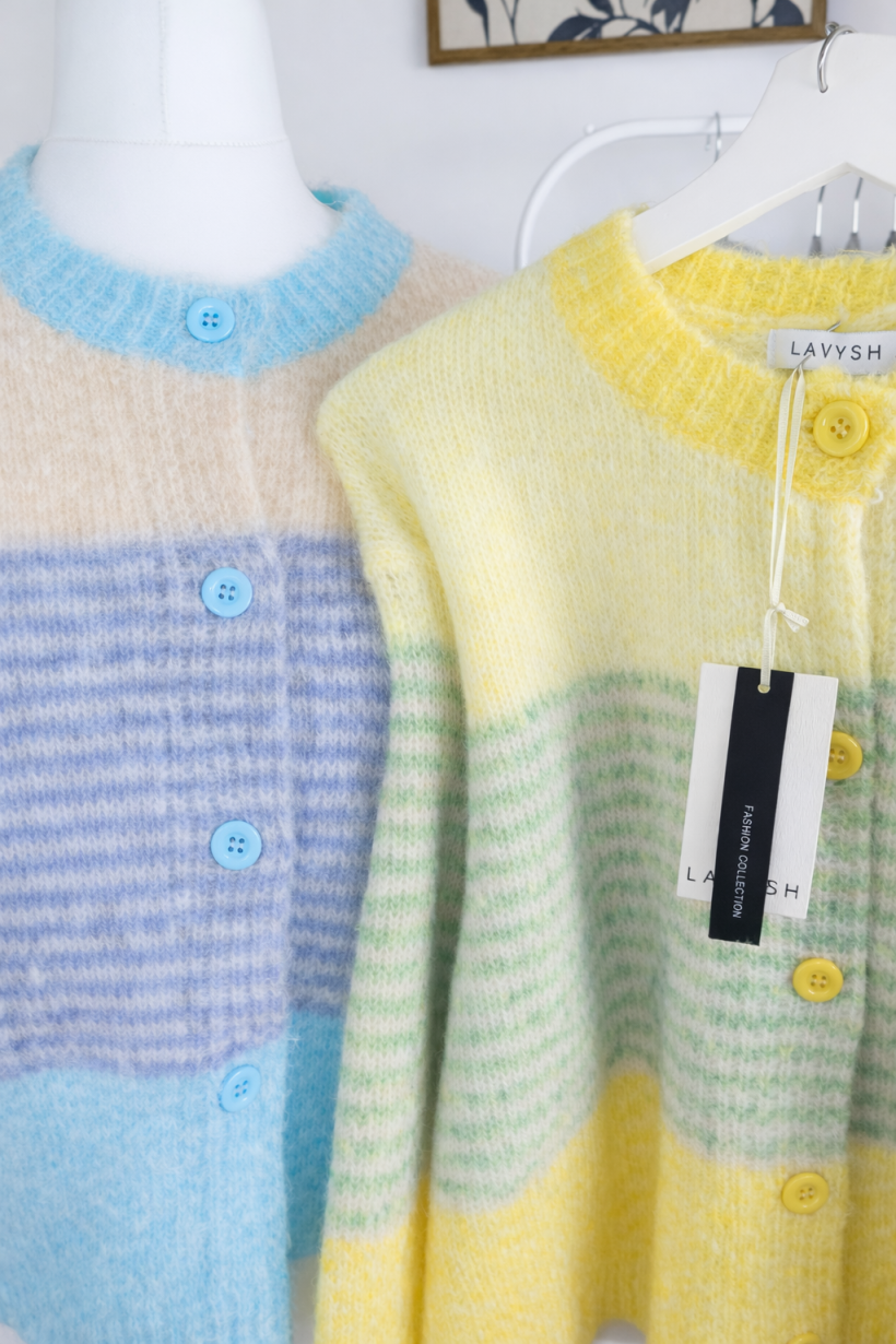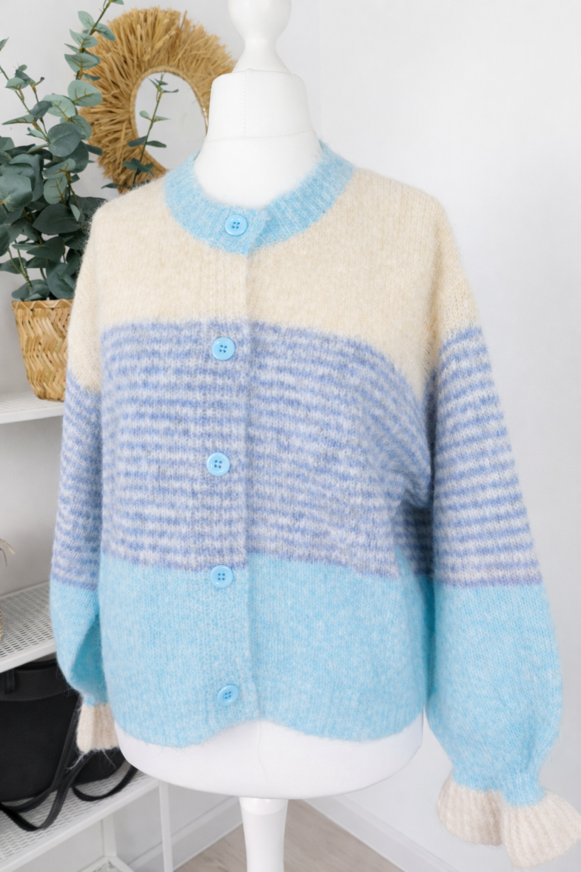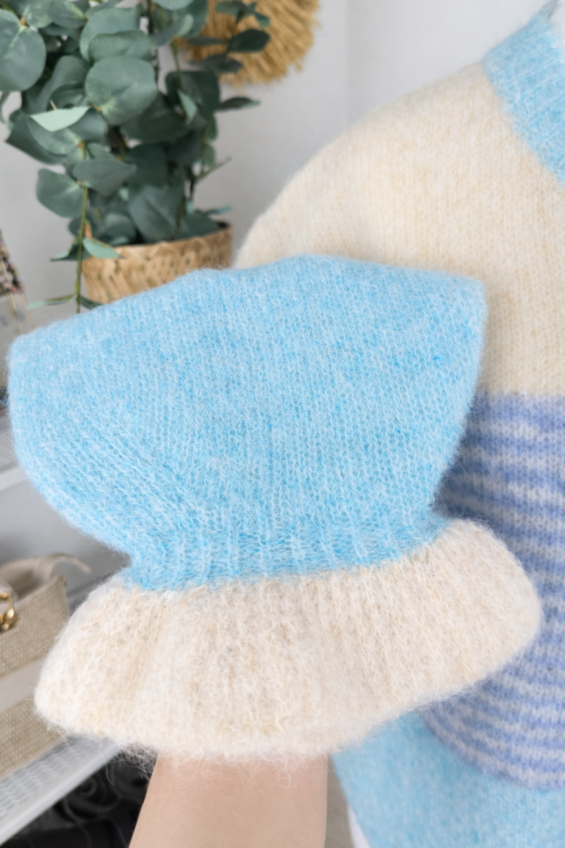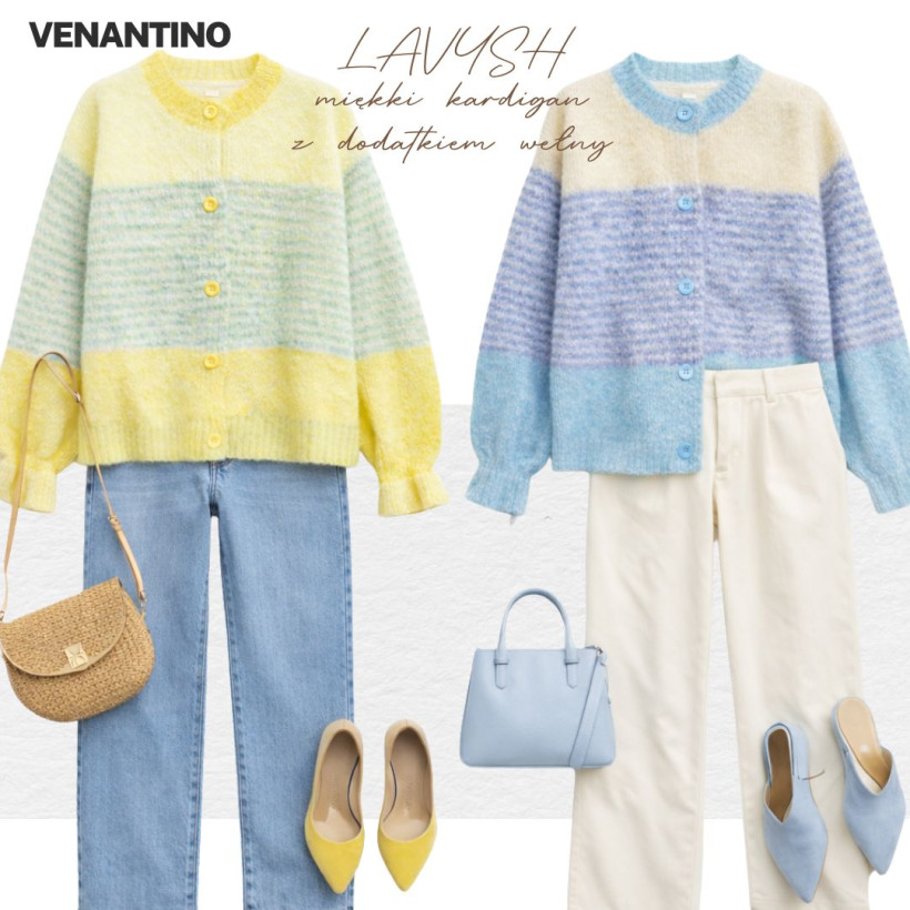 Zachwyca subtelnymi przejściami kolorów i miękką, puszystą fakturą. Delikatne pasy i pastelowa paleta nadają mu świeżości i wiosennej lekkości 🌿
