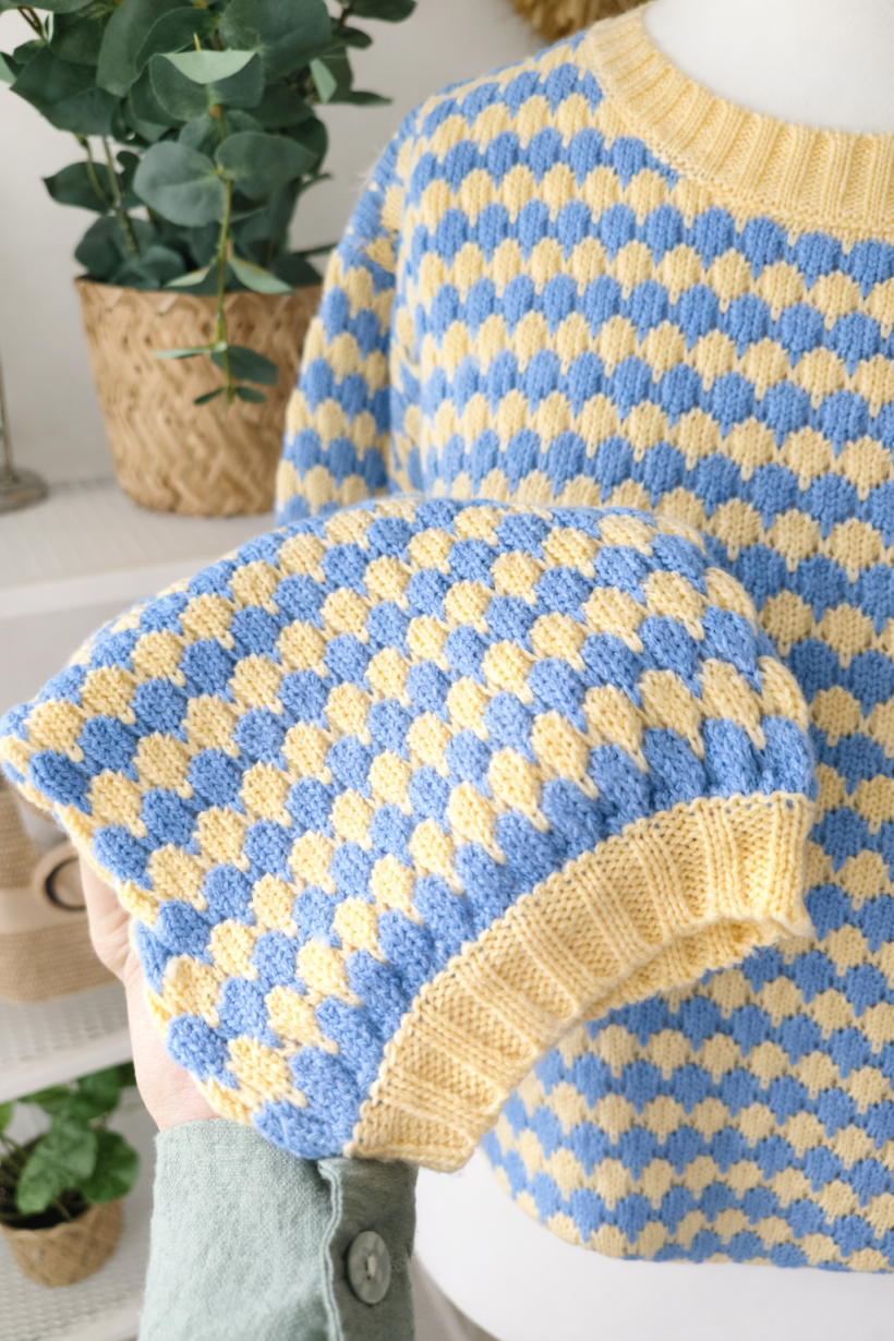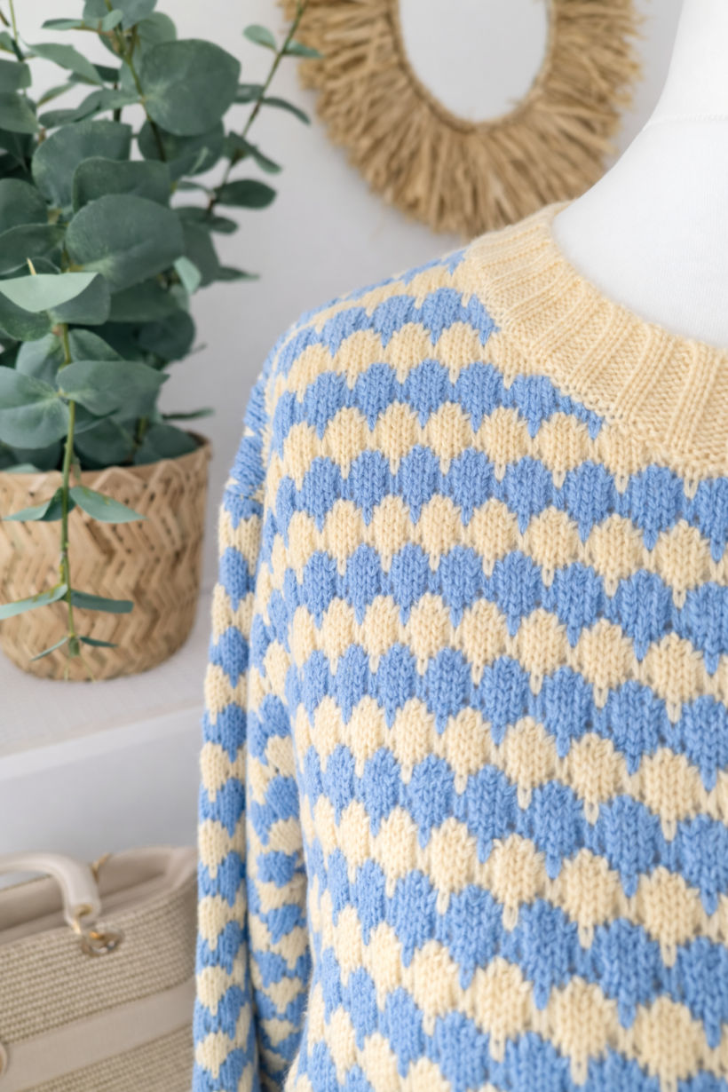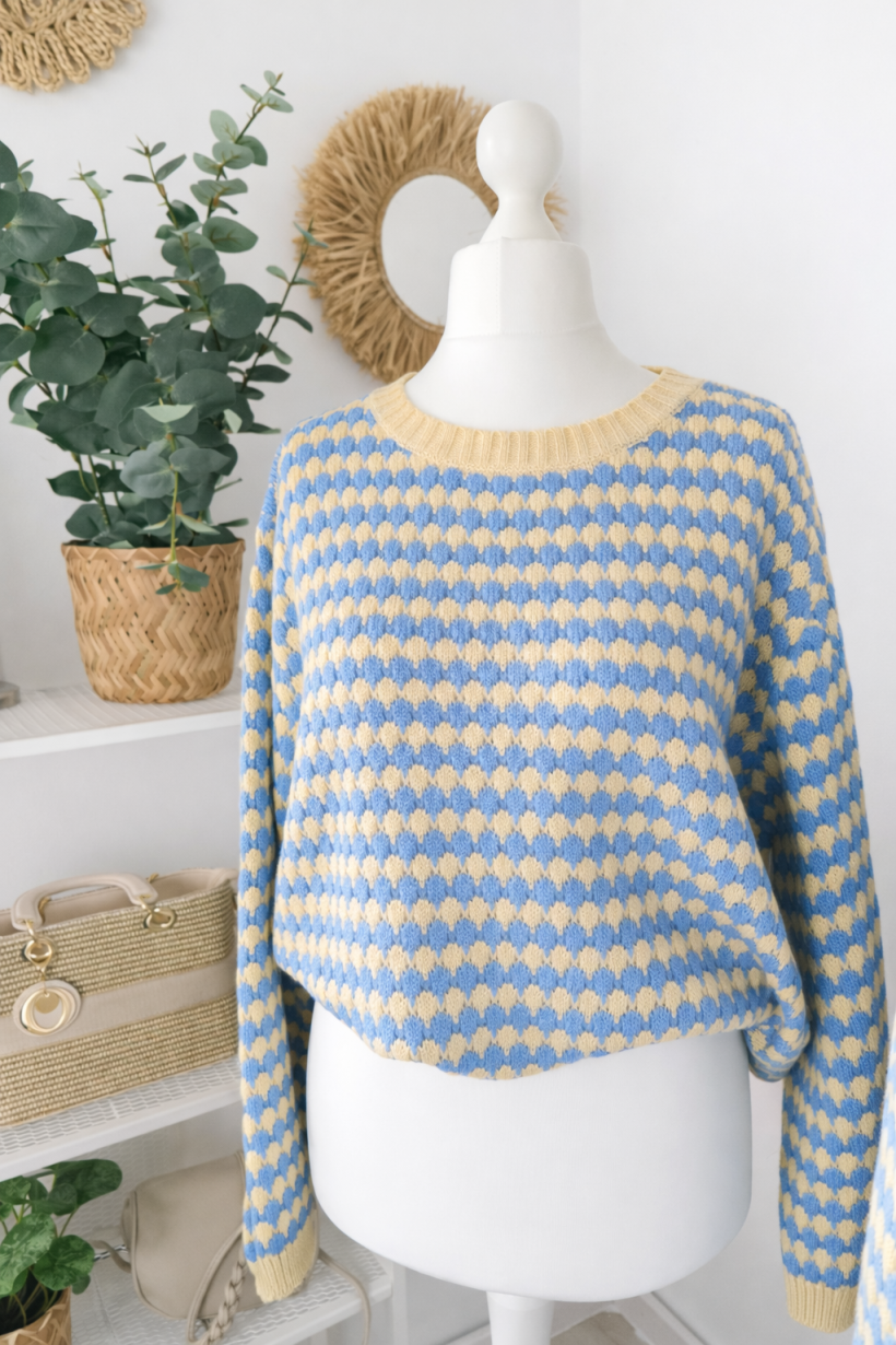 Miękki, przyjemny w dotyku sweter w połączeniu błękitu i wanilii tworzy wyjątkowy, lekko vintage’owy wzór, który od razu przyciąga spojrzenia.