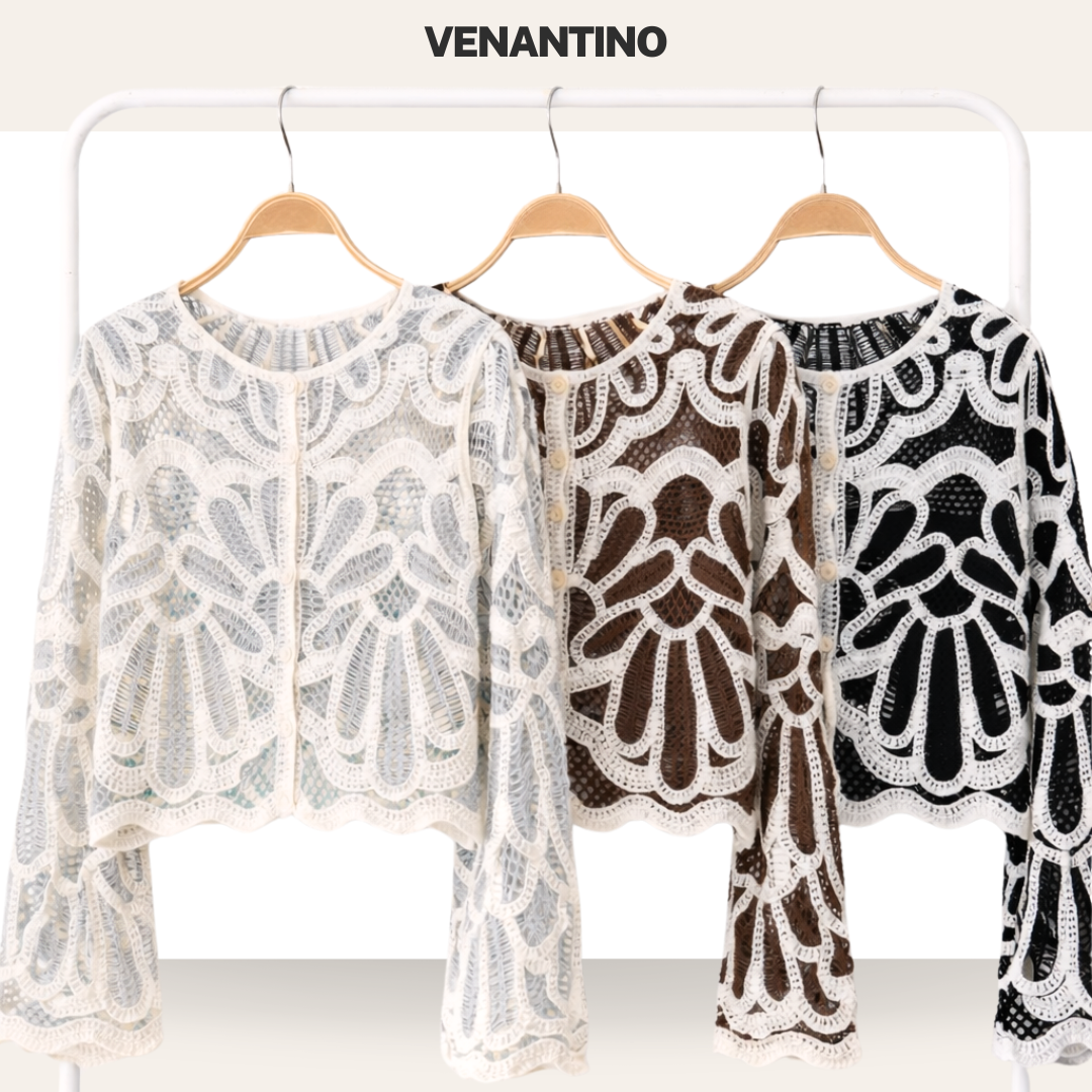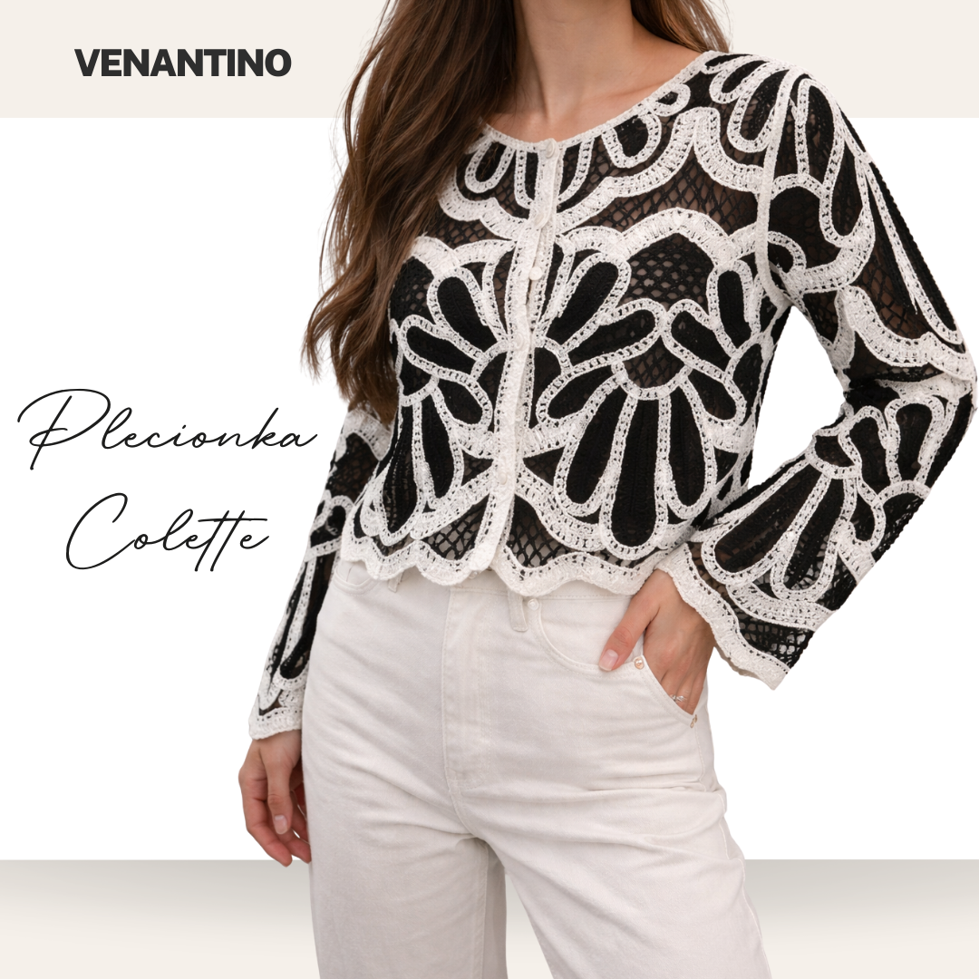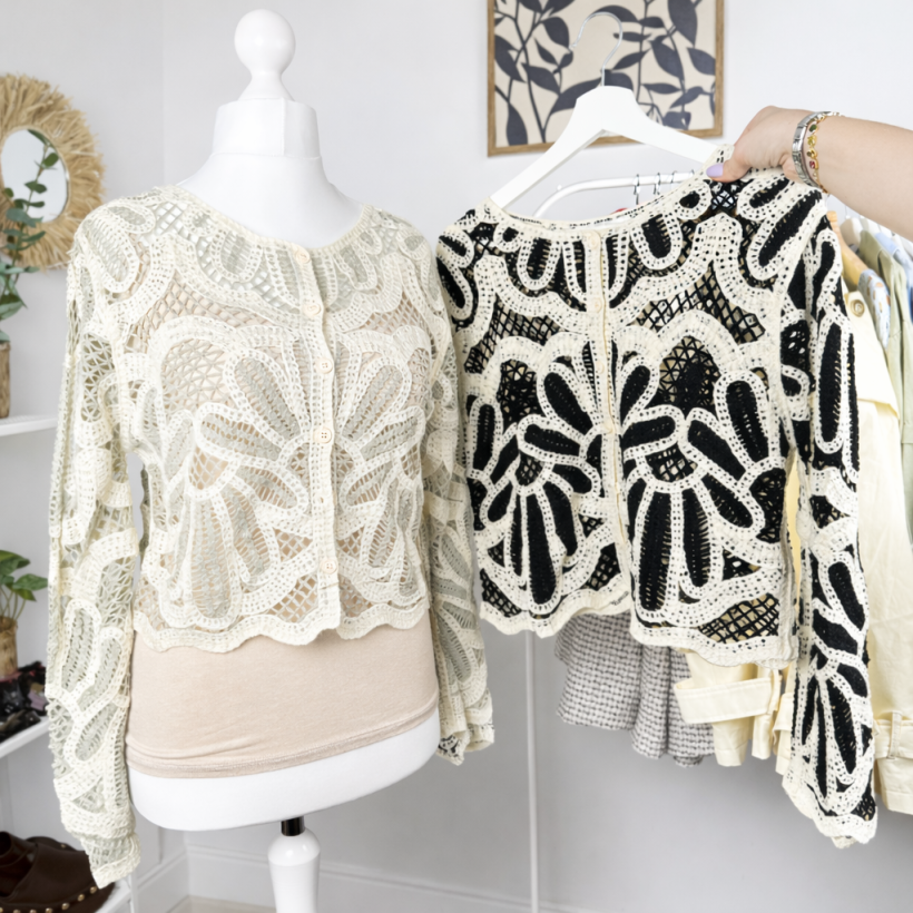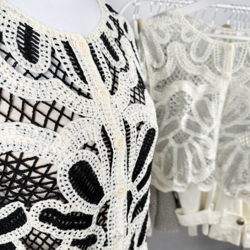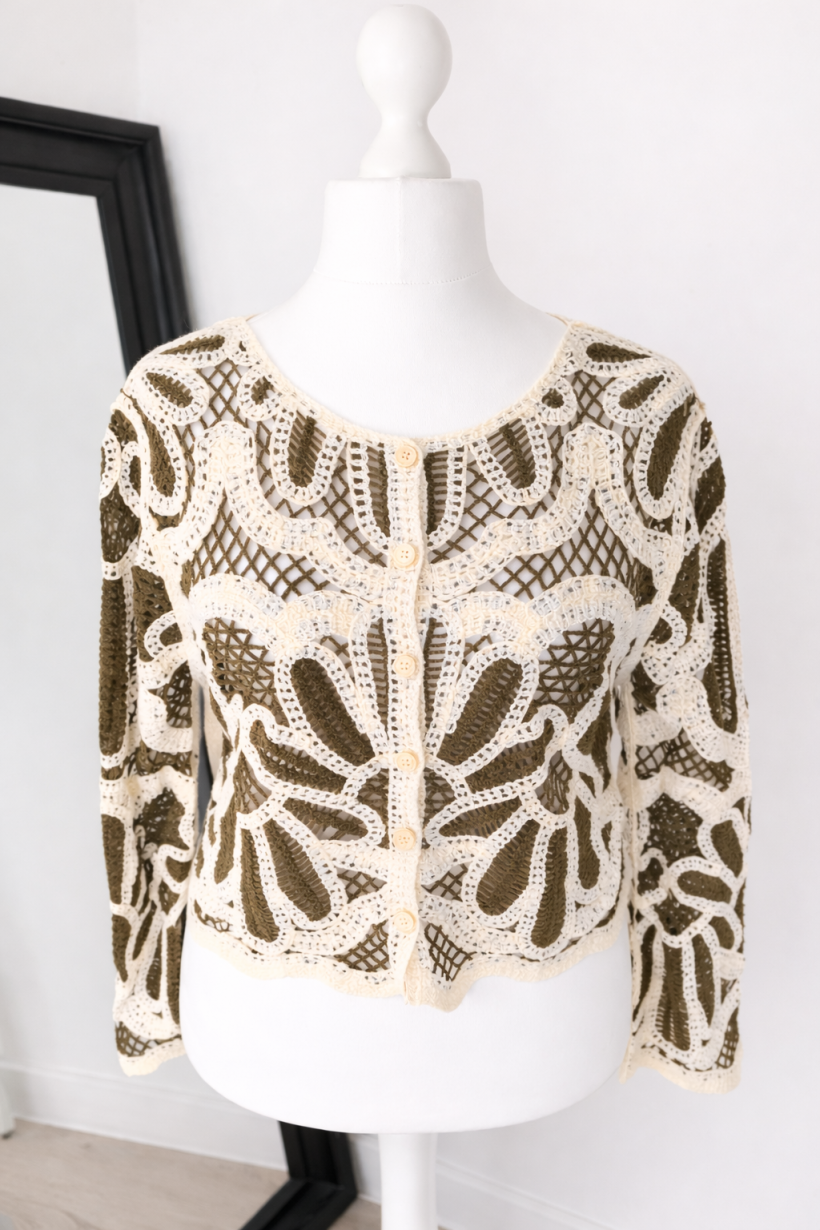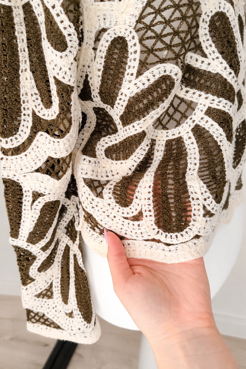 Bogaty wzór przeplata się z siateczkową strukturą, tworząc efekt lekkości i elegancji jednocześnie. Ażurowe wykończenie sprawia, że sweter pięknie prezentuje się na topie, body lub dopasowanej bazie.