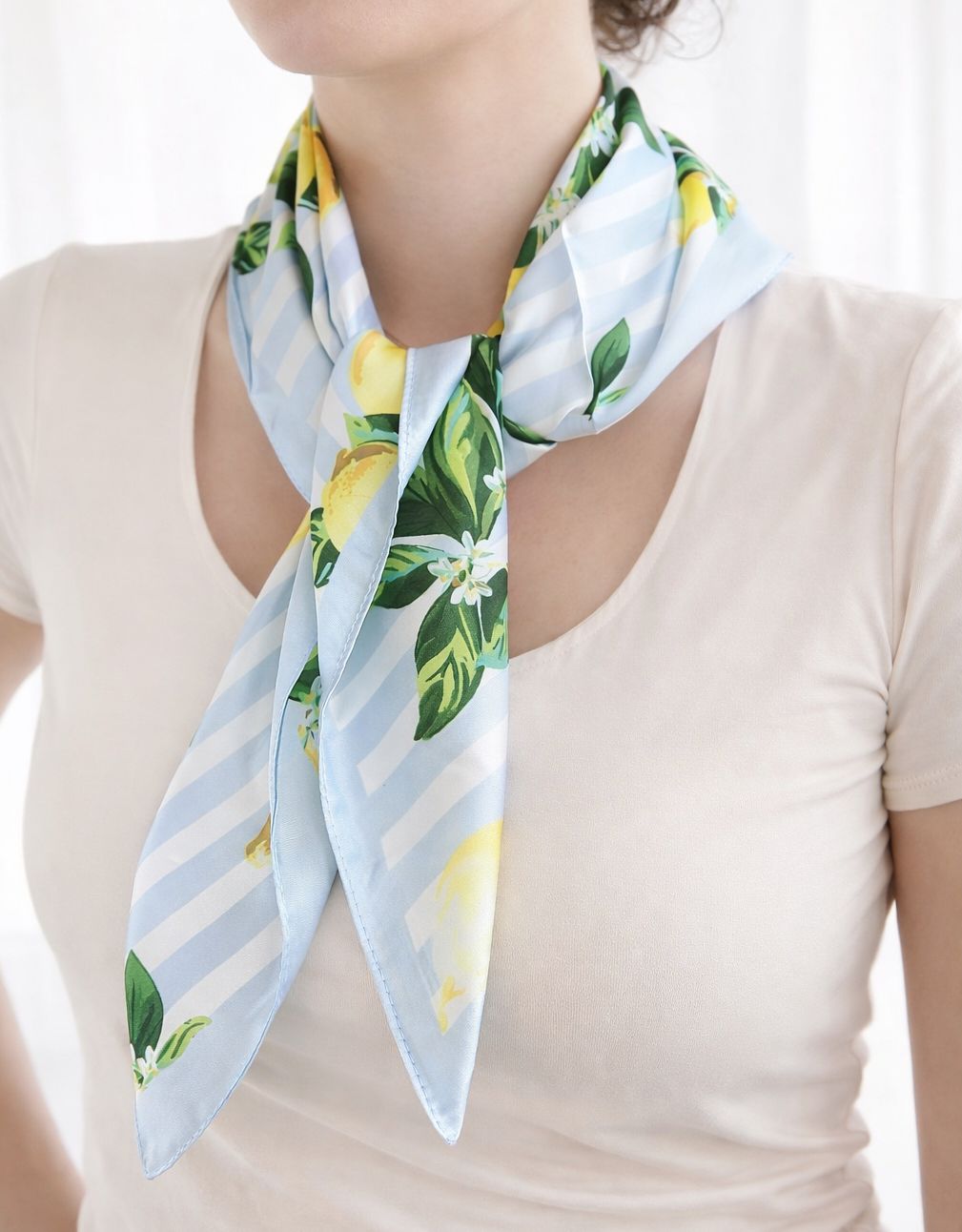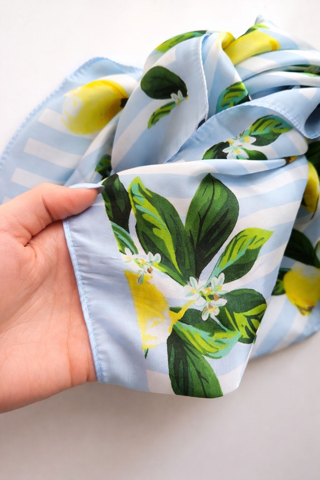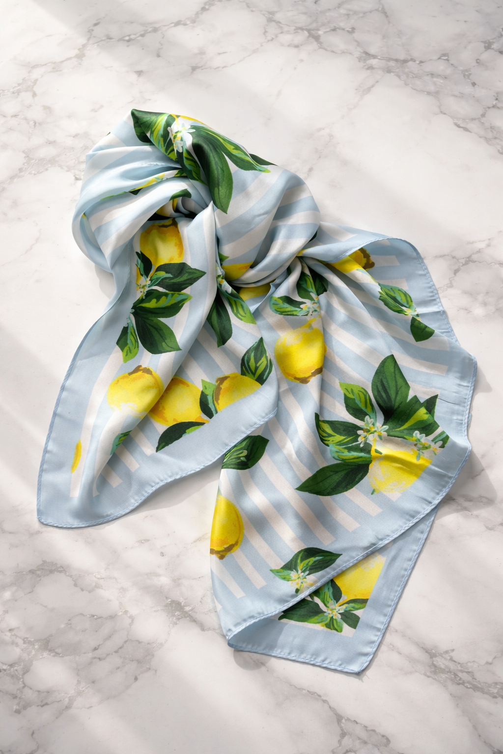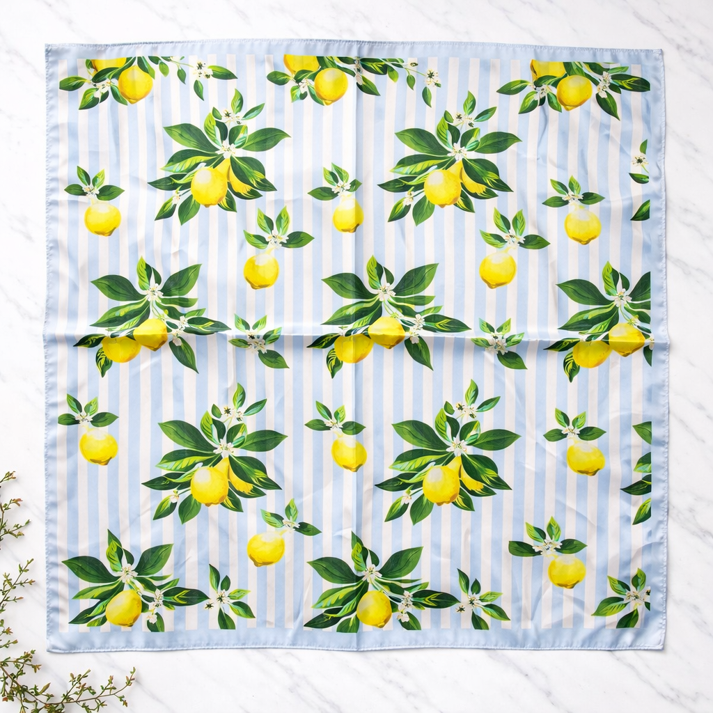 Apaszka w cytrynowy print na błękitno-białym tle w pasy.