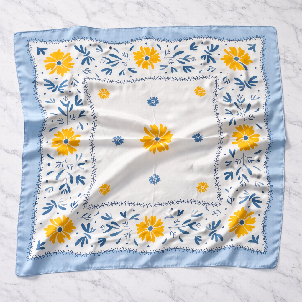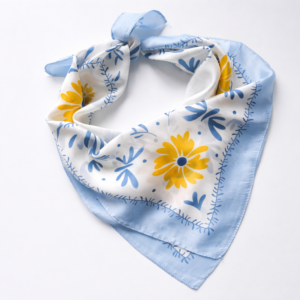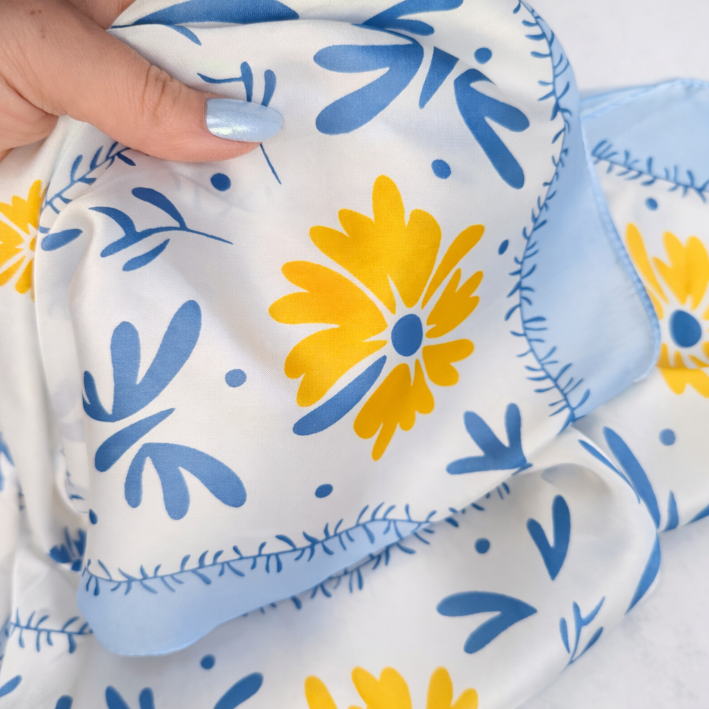 Delikatna apaszka z motywem kwiatów w odcieniach błękitu i słonecznej żółci, która przyciąga lekkością i świeżością. Subtelny wzór inspirowany naturą nadaje stylizacji dziewczęcego, ale eleganckiego charakteru. Idealna na wiosnę i lato.