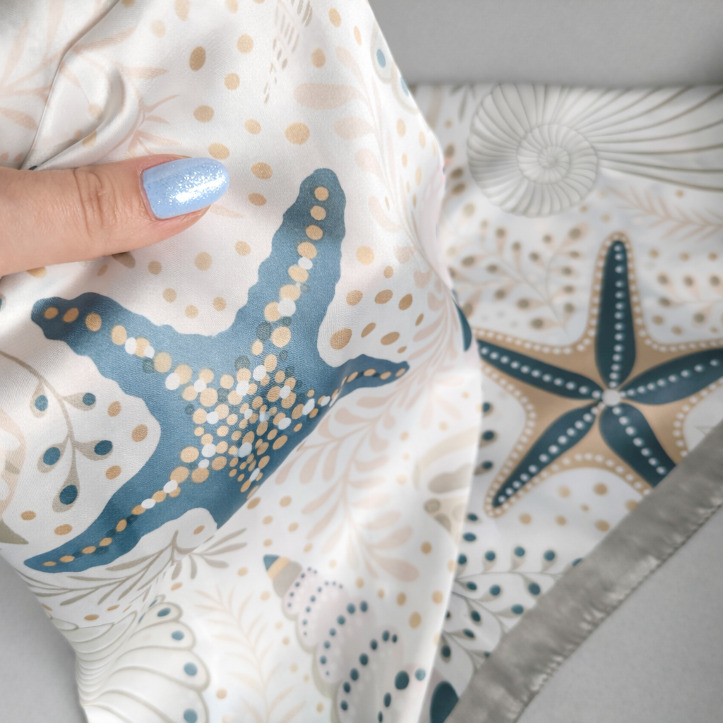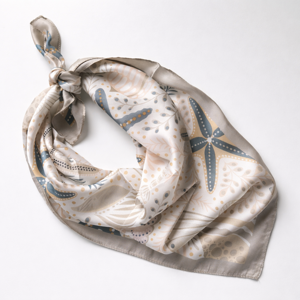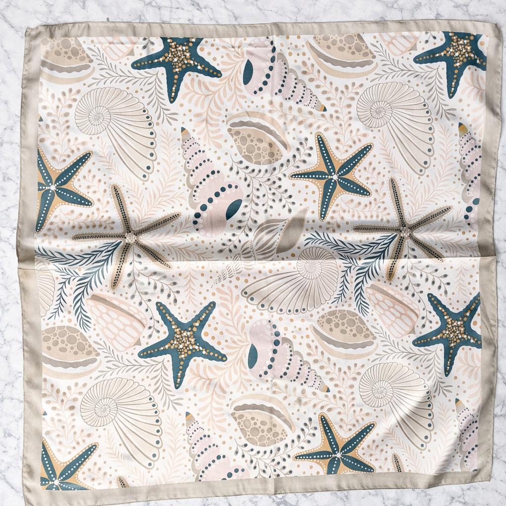 Apaszka w subtelnych, kremowych odcieniach z motywem muszli i rozgwiazd tworzy spokojną, elegancką kompozycję inspirowaną naturą.