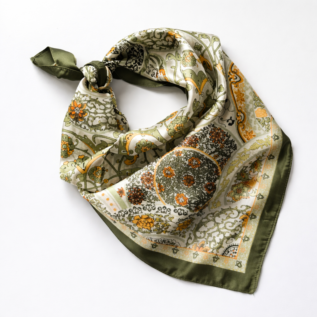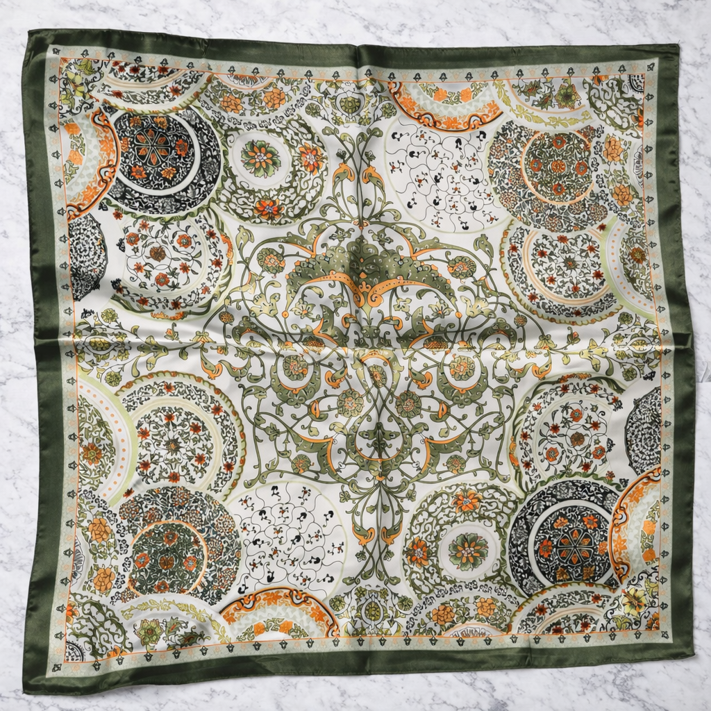 Delikatna, jasna baza połączona z oliwkową zielenią i ciepłymi akcentami tworzy wzór inspirowany klasycznymi ornamentami.