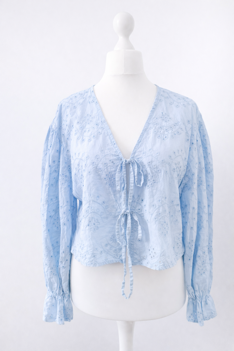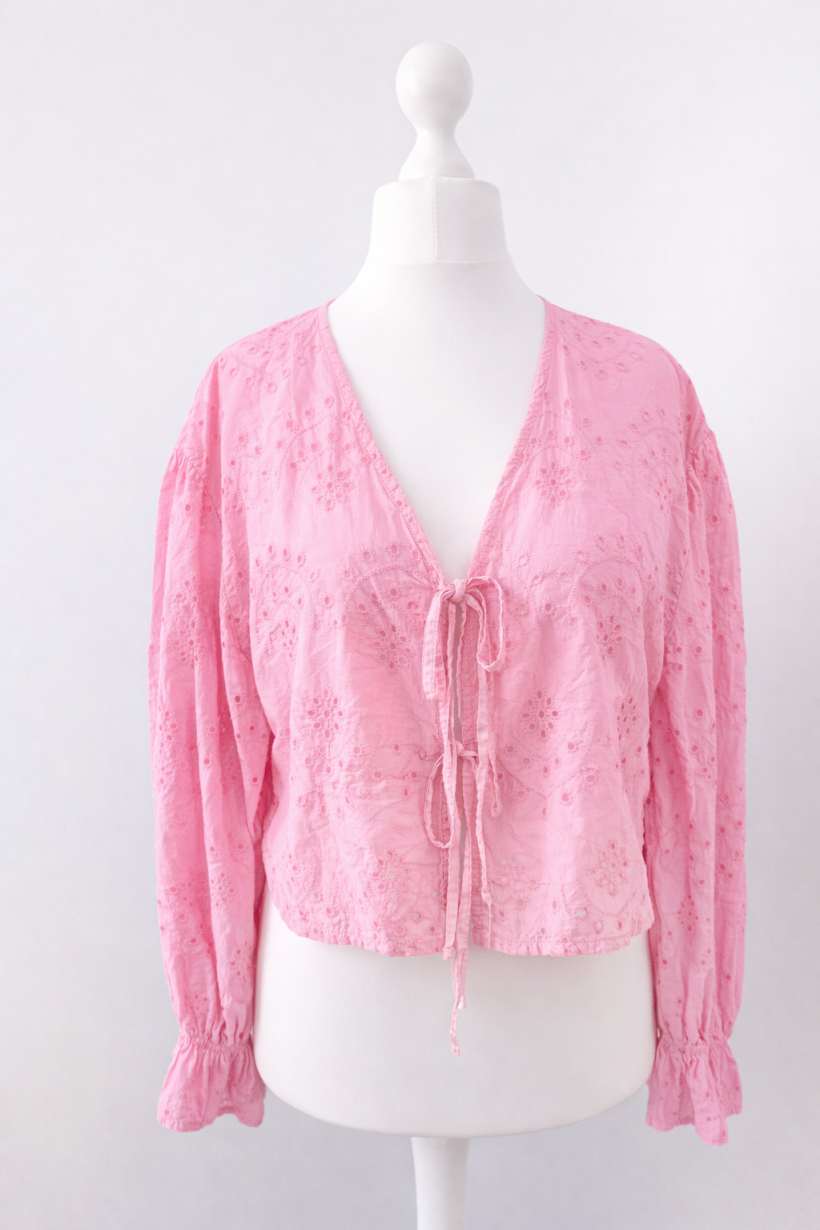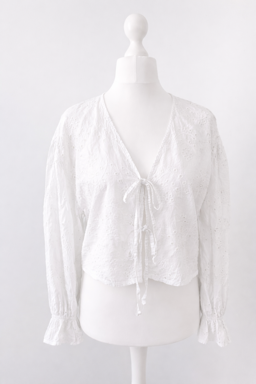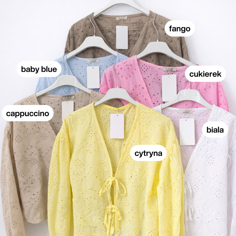 Delikatna ażurowa tkanina nadaje stylizacji romantycznego charakteru.