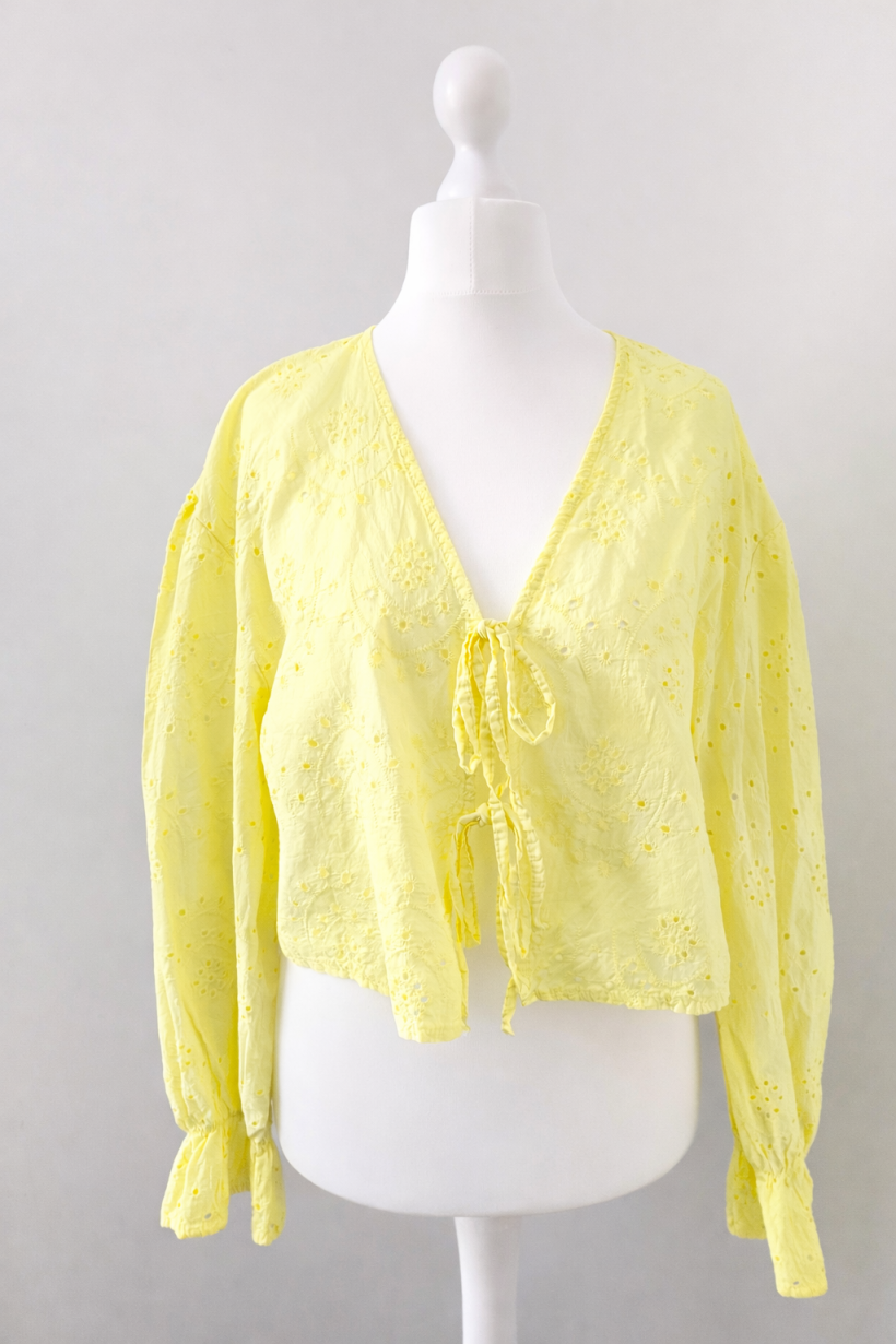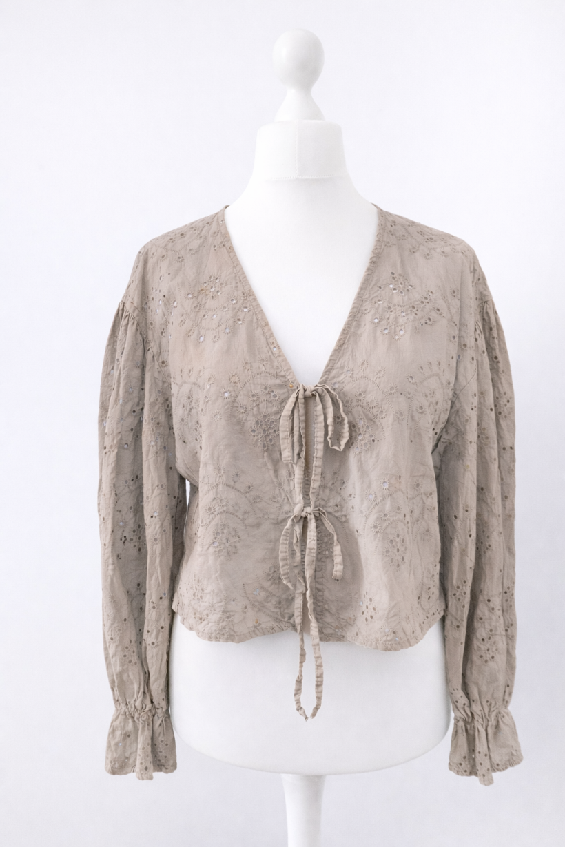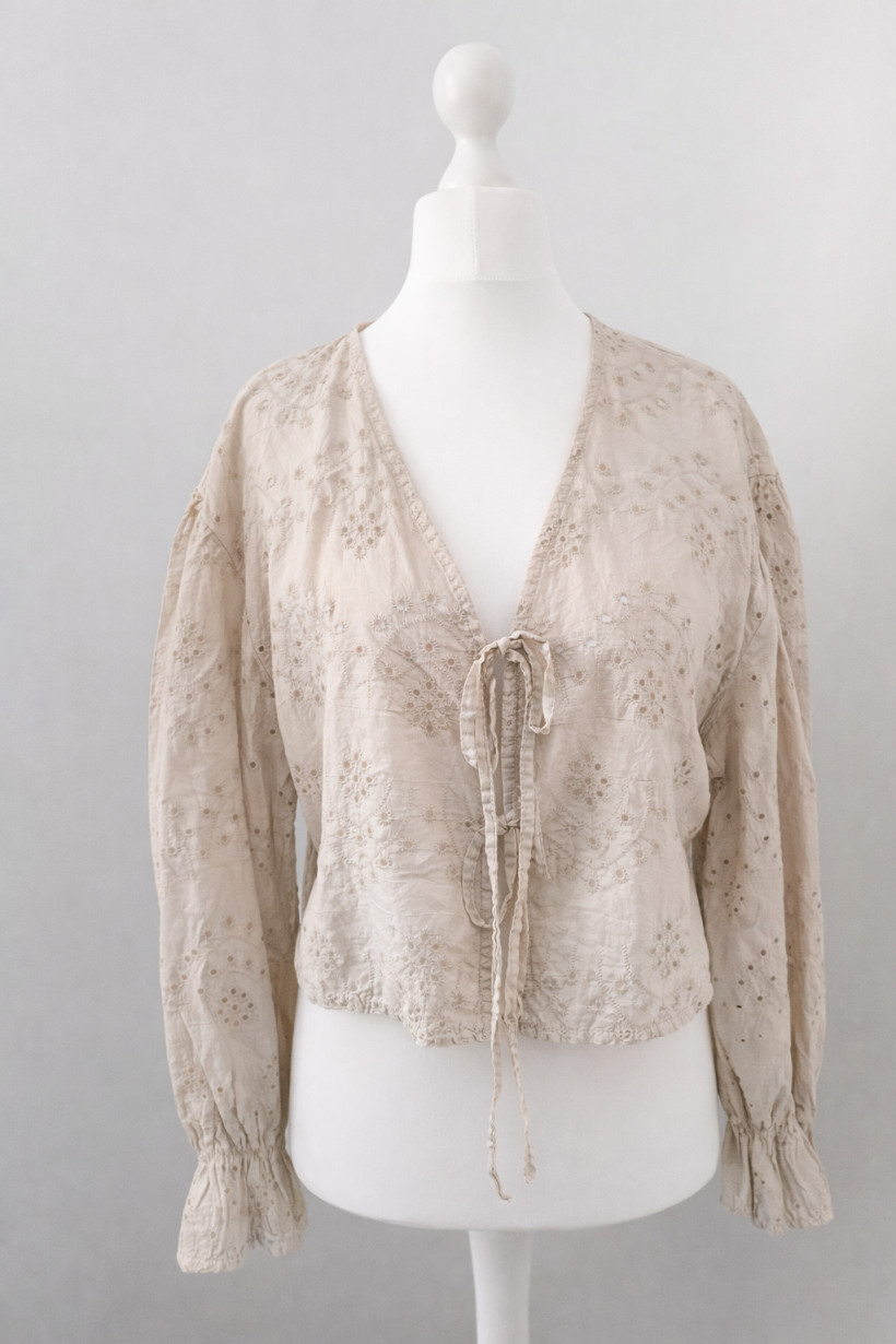Delikatna ażurowa tkanina nadaje stylizacji romantycznego charakteru.