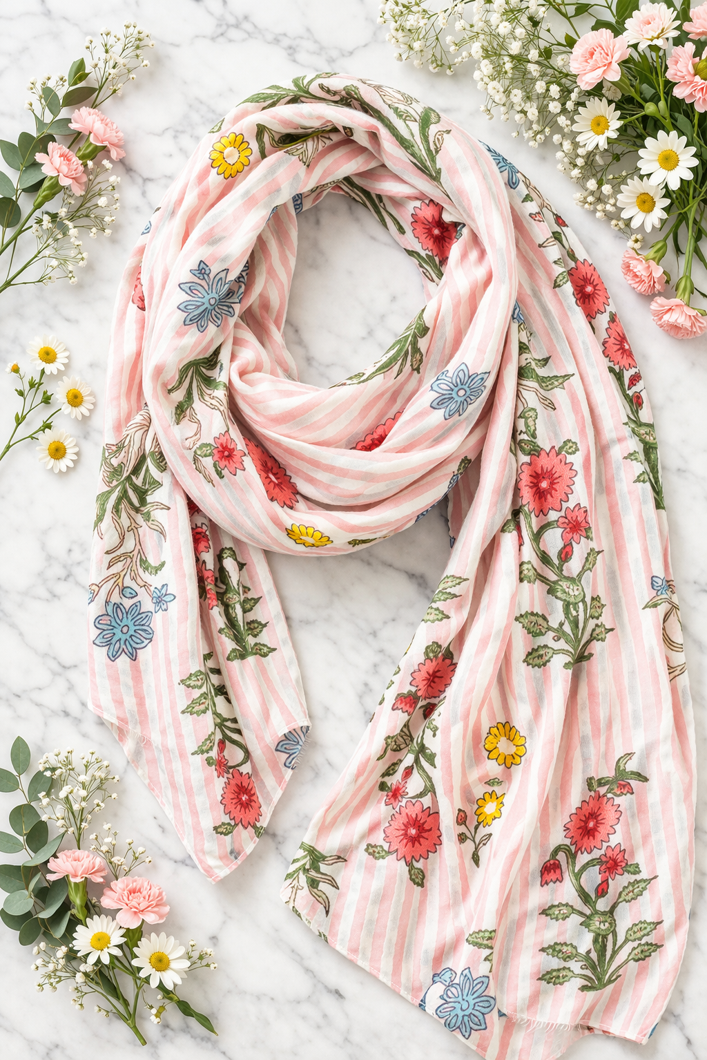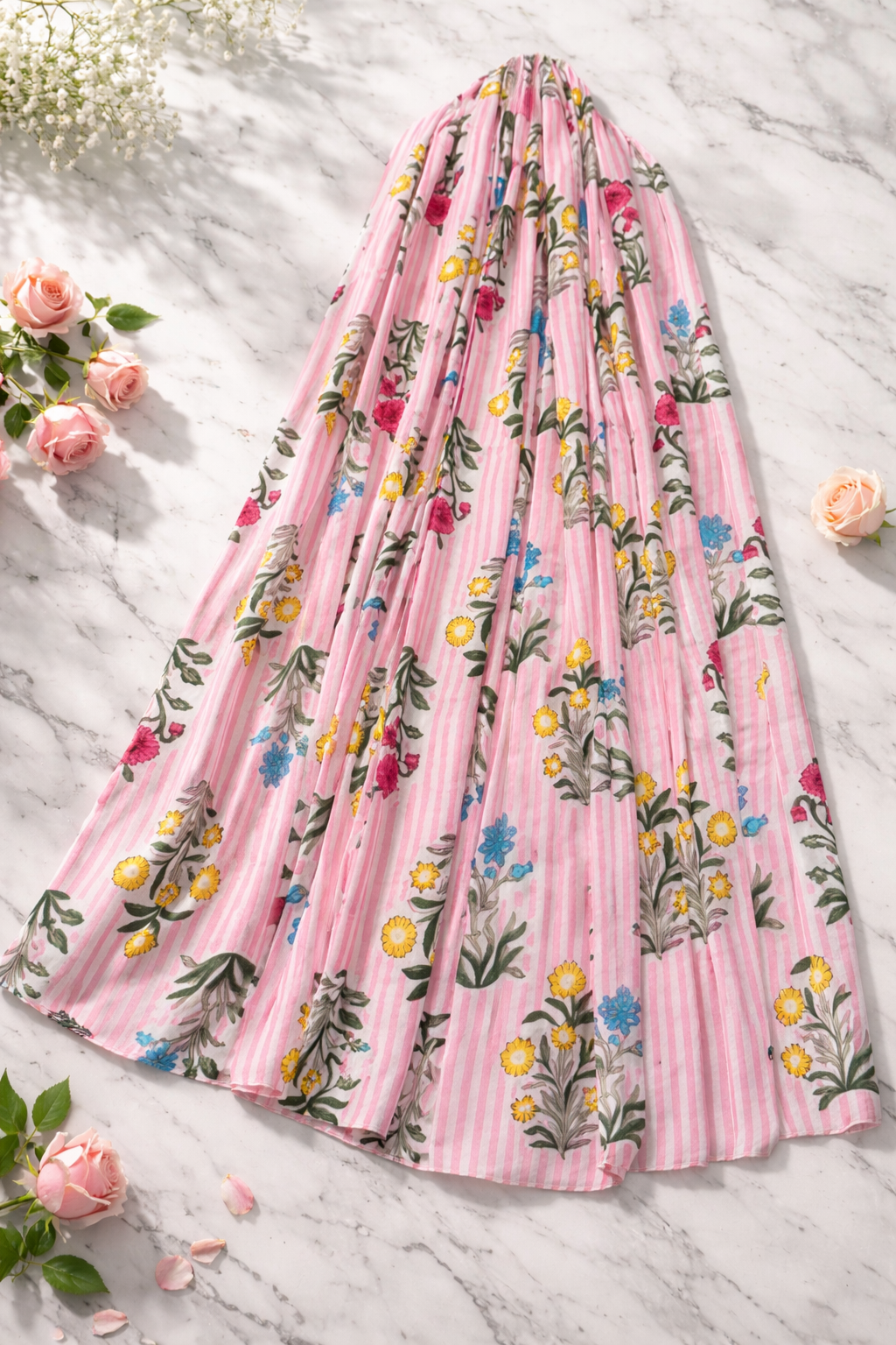 Ten model przyciąga uwagę subtelnym połączeniem pastelowych pasków i kwiatowego motywu, który wygląda jak ręcznie malowany.
