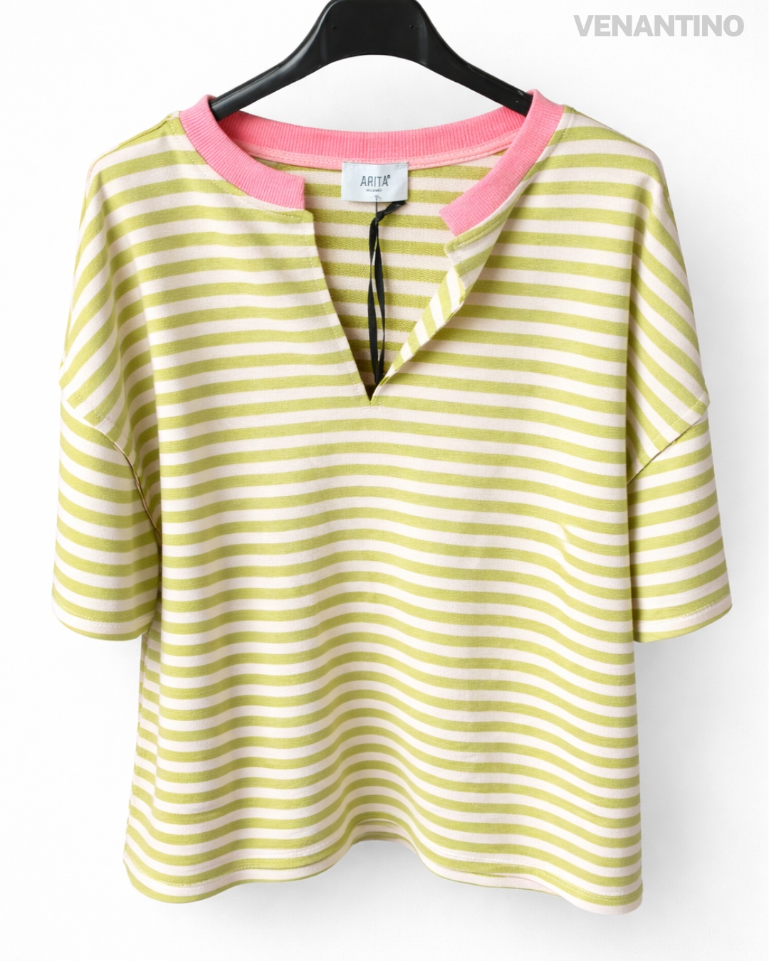 Klasyczne paski, ale przełamane kolorem i detalem przy dekolcie sprawiają, że całość wygląda świeżo, lekko i nowocześnie, a nie jak kolejny basic.