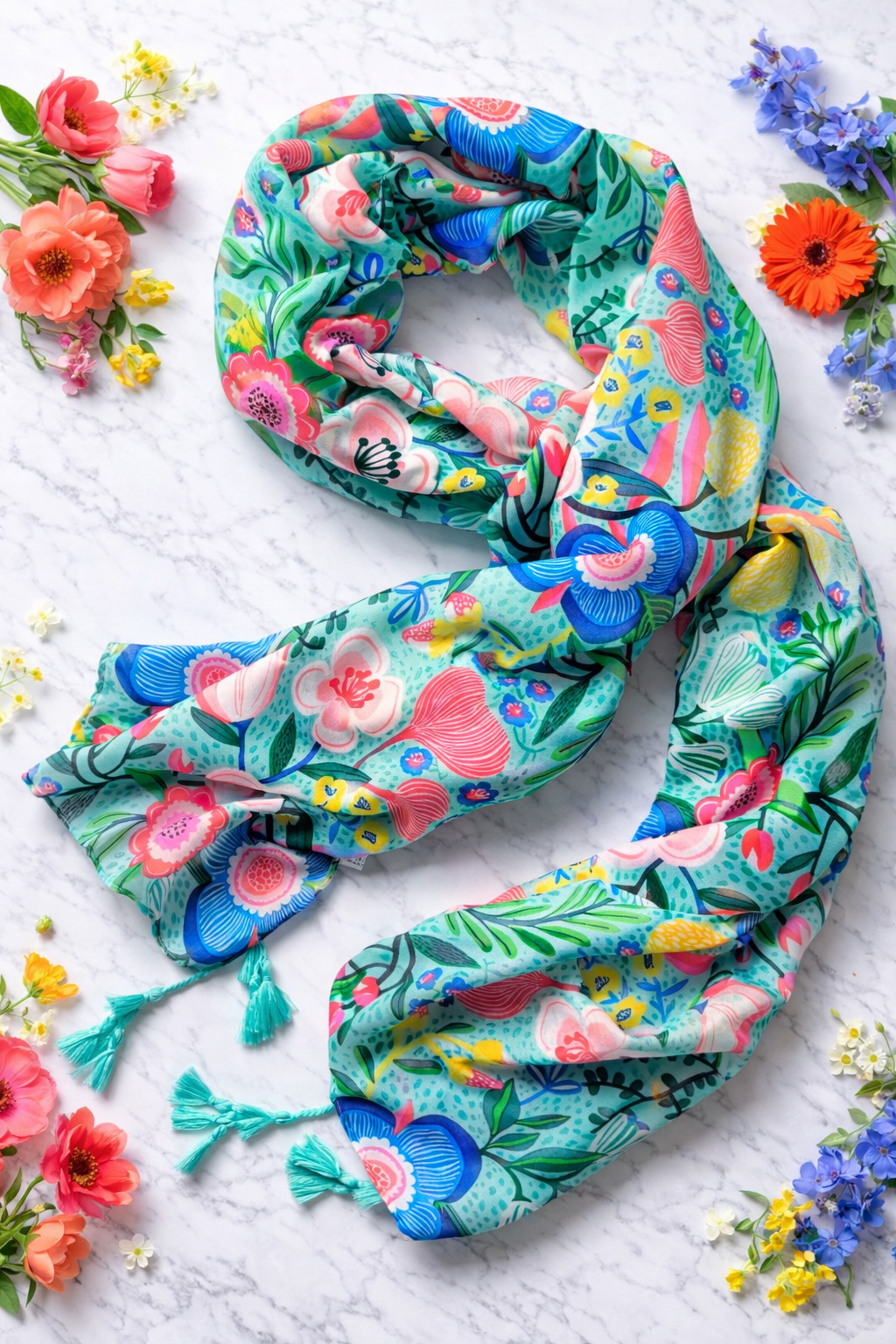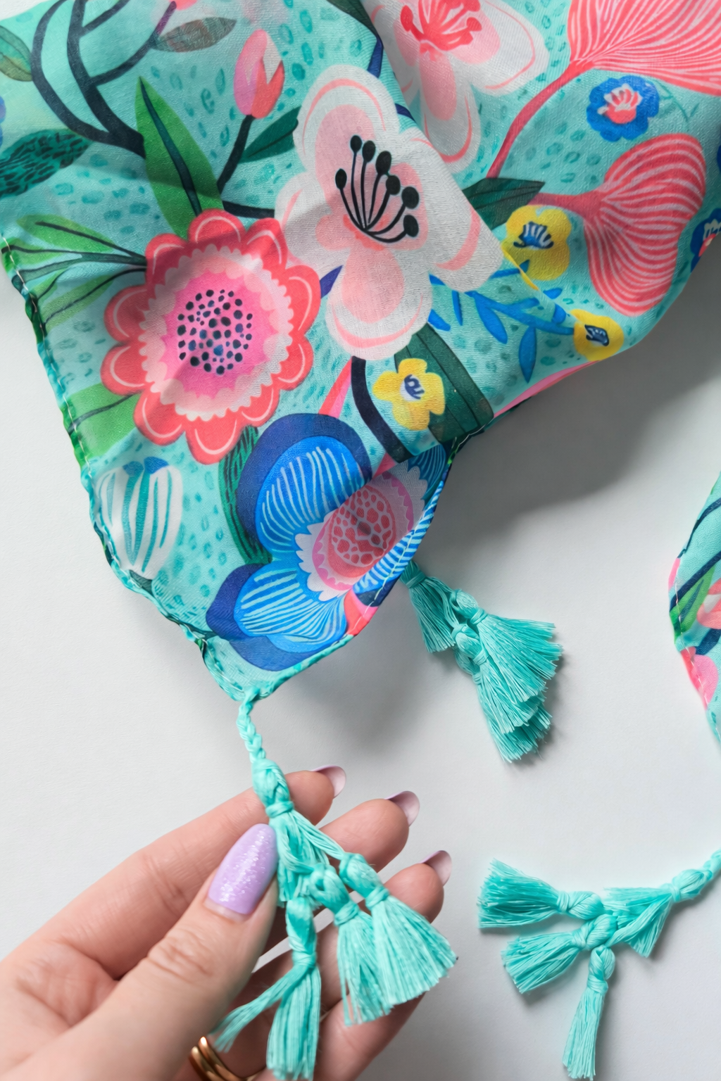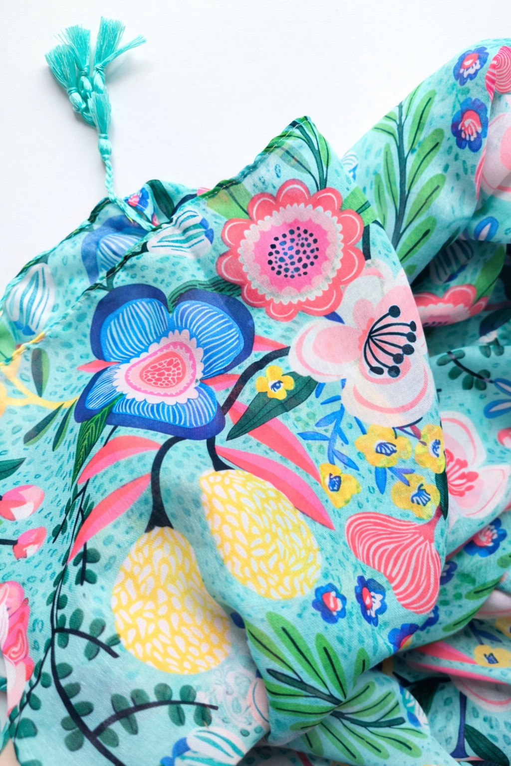 Soczysta zieleń, róż, błękit i żółte akcenty tworzą print, który wygląda jak ręcznie malowany.