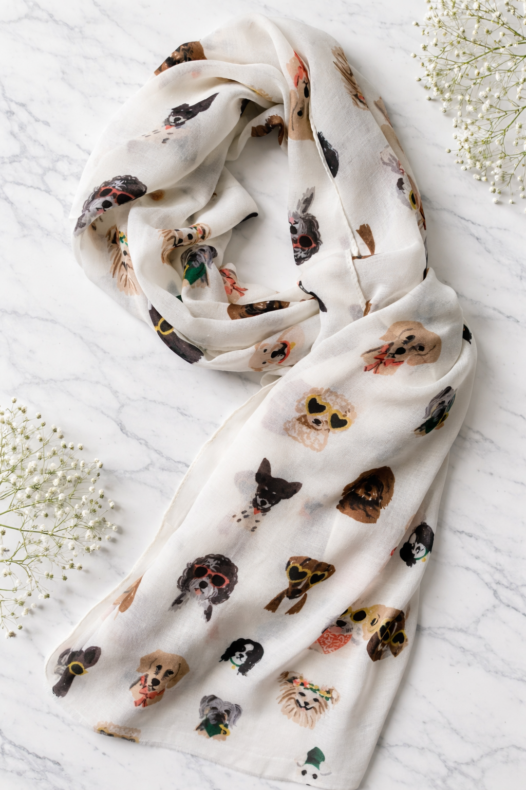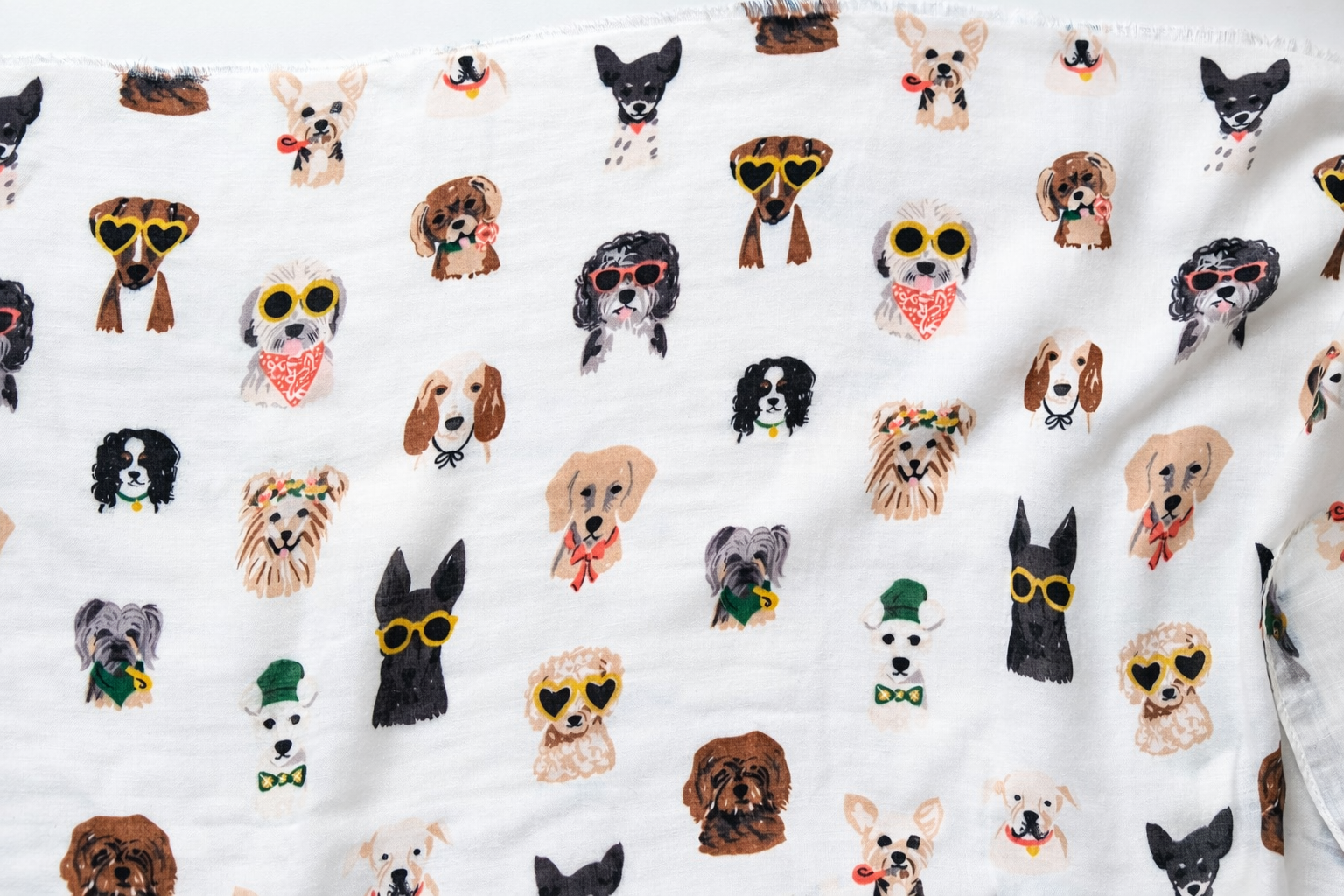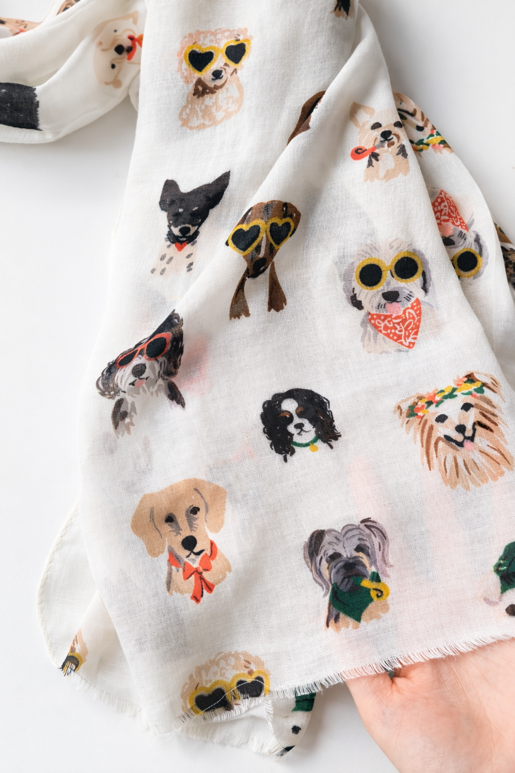 Subtelna, kremowa baza i rysunkowe psy z detalami (okulary, apaszki, małe akcenty koloru).