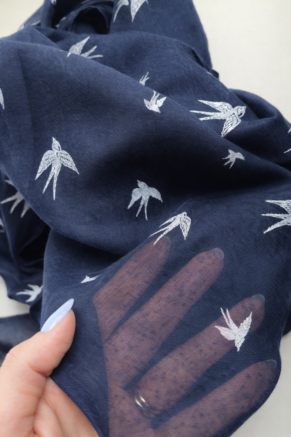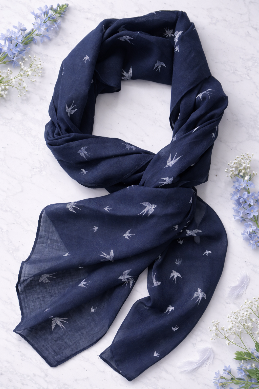 Subtelny motyw jaskółek na głębokim, eleganckim tle. Delikatnie otula, miękko układa się na szyi i dodaje stylizacji lekkości ✨
