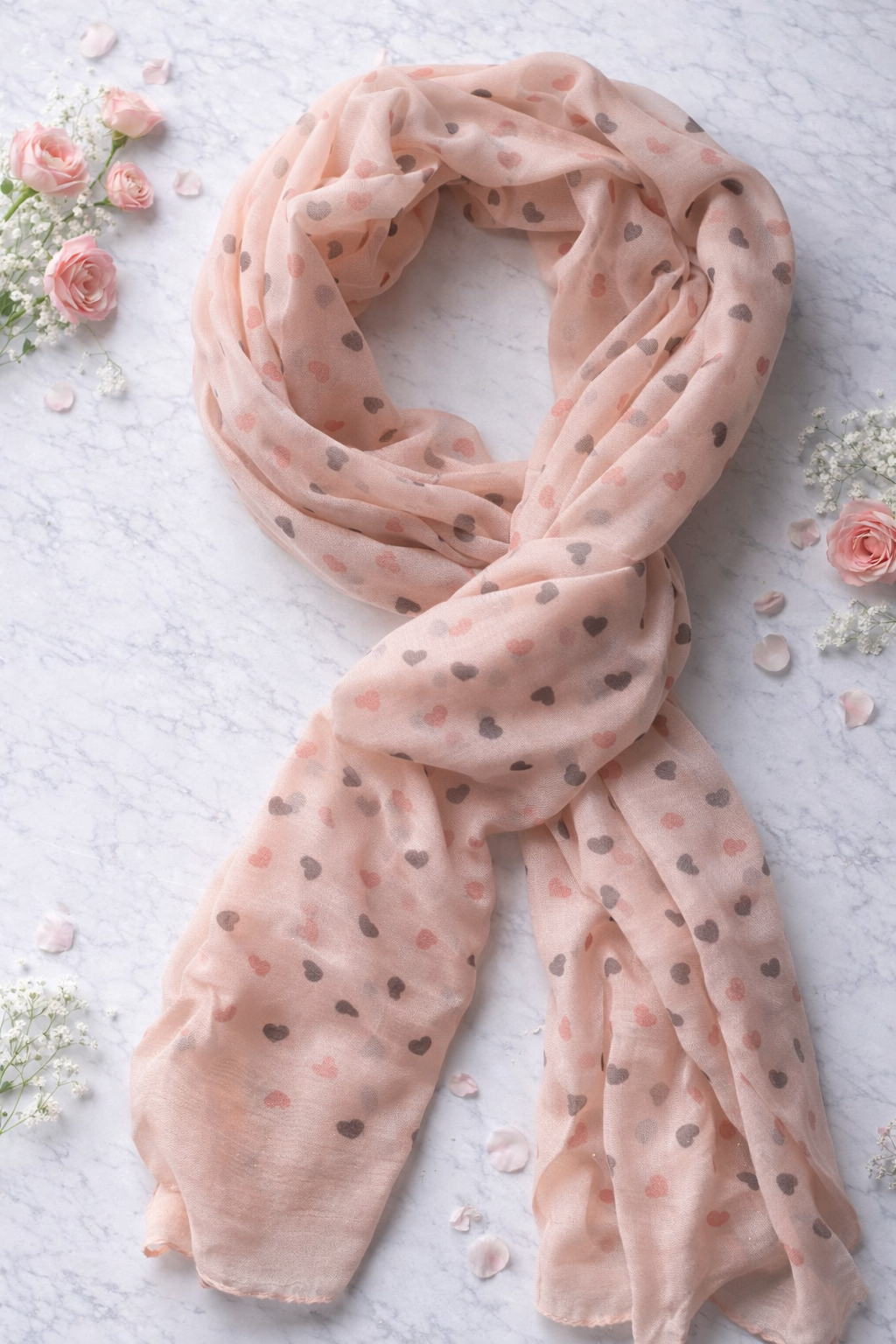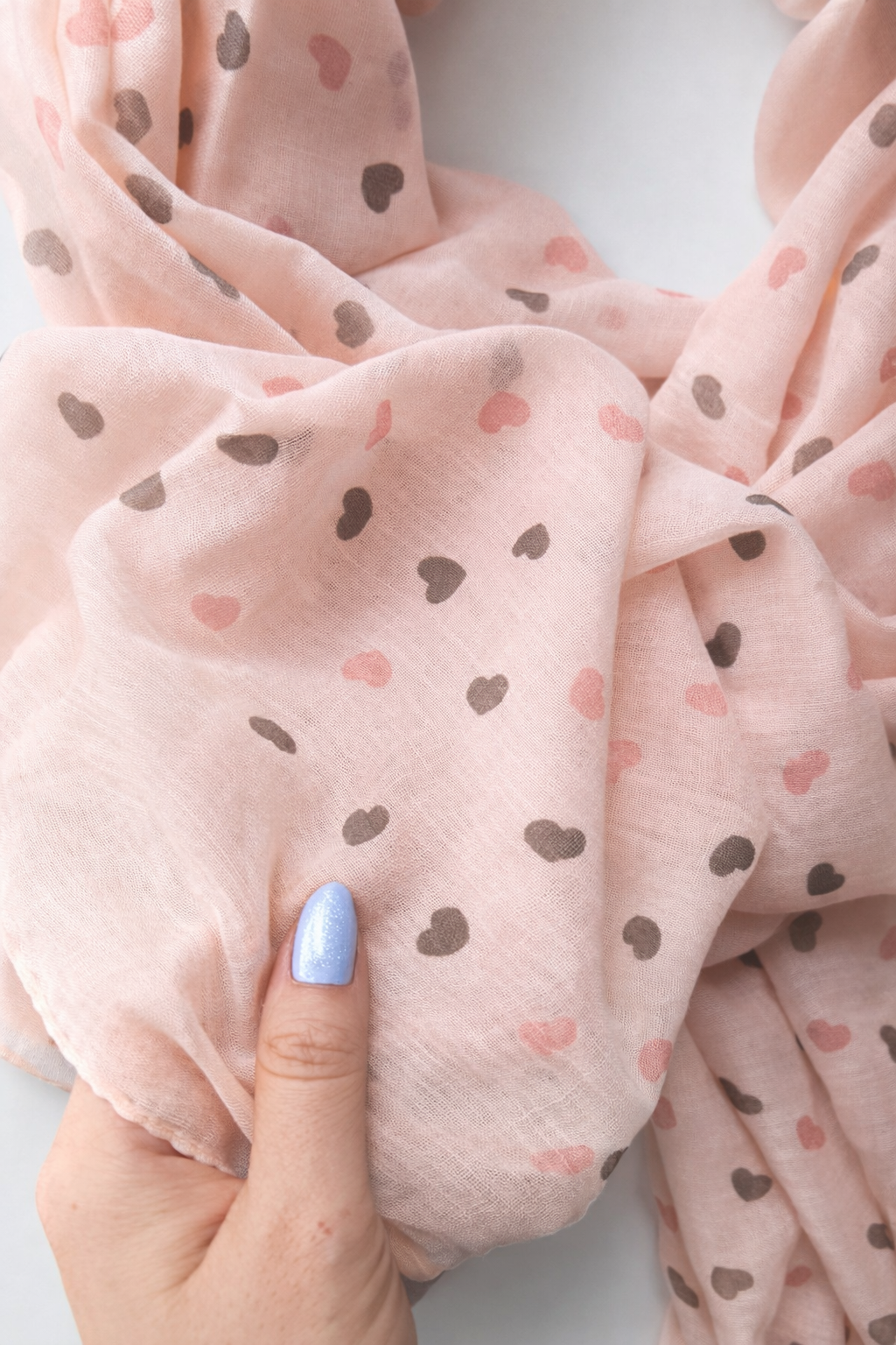 Lekki, subtelny i niezwykle kobiecy – ten szal przyciąga spojrzenie delikatnym motywem drobnych serduszek na pudrowym tle. Dodaje stylizacji miękkości i ciepła, ale w bardzo nienachalny sposób ✨