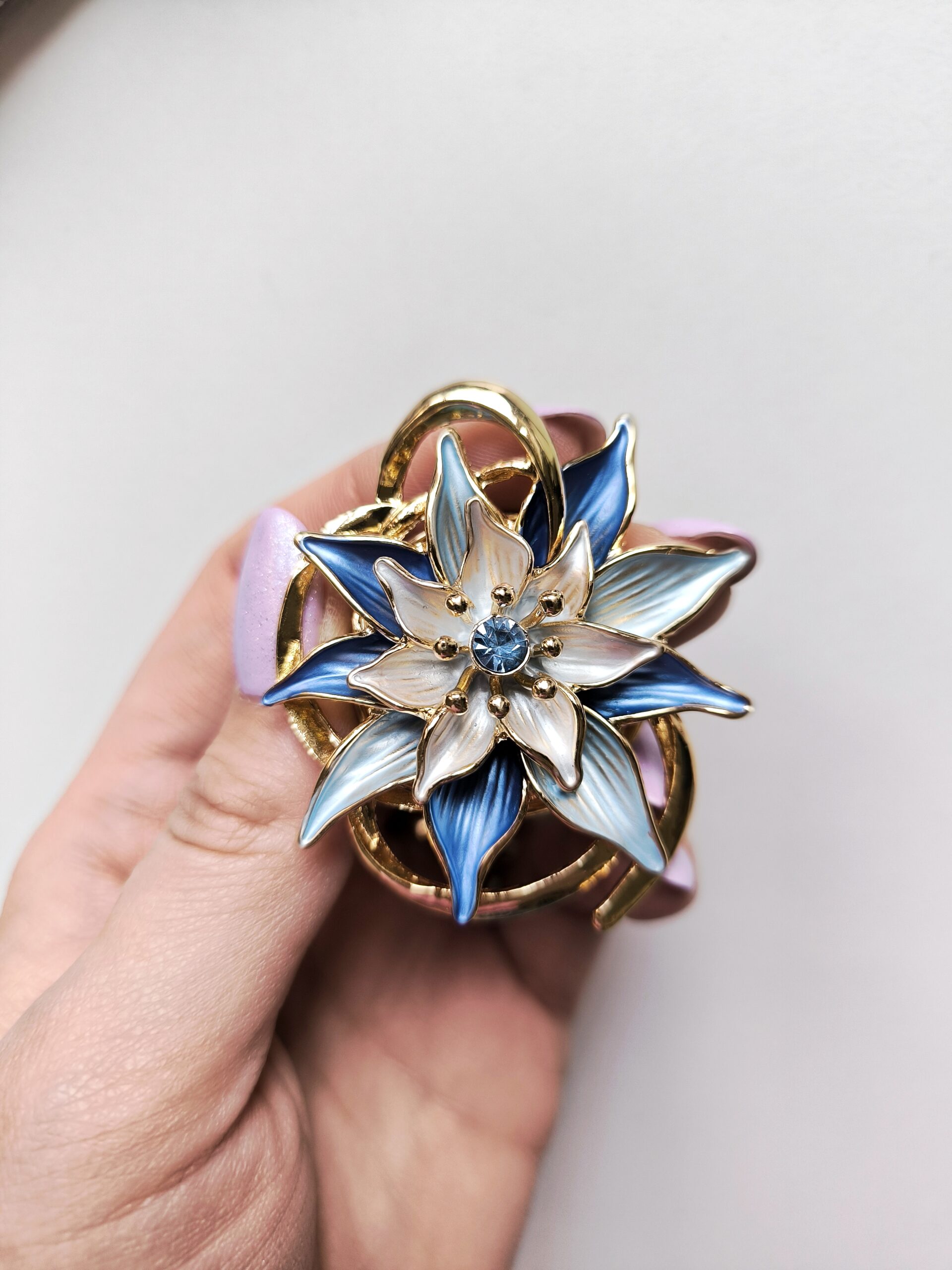 Kwiatowa forma w chłodnych odcieniach błękitu i bieli, wykończona złotymi detalami.