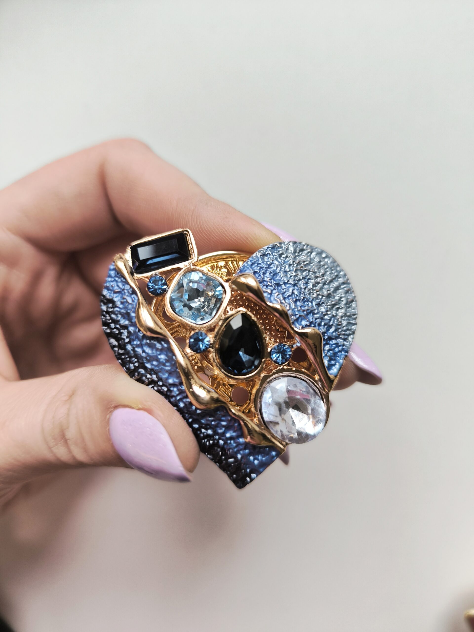 Złote detale i różnorodne kamienie tworzą kompozycję, która wygląda jak mały element biżuterii artystycznej. Każdy fragment odbija światło inaczej, dzięki czemu broszka zmienia się przy każdym ruchu.