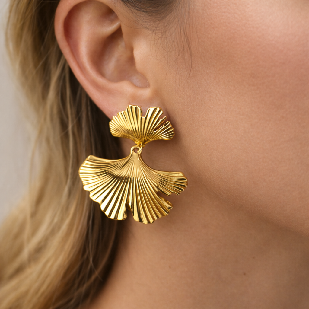 Dwuczęściowa konstrukcja pięknie pracuje w ruchu – górny liść subtelnie przylega do ucha, a dolny delikatnie się porusza, odbijając światło.