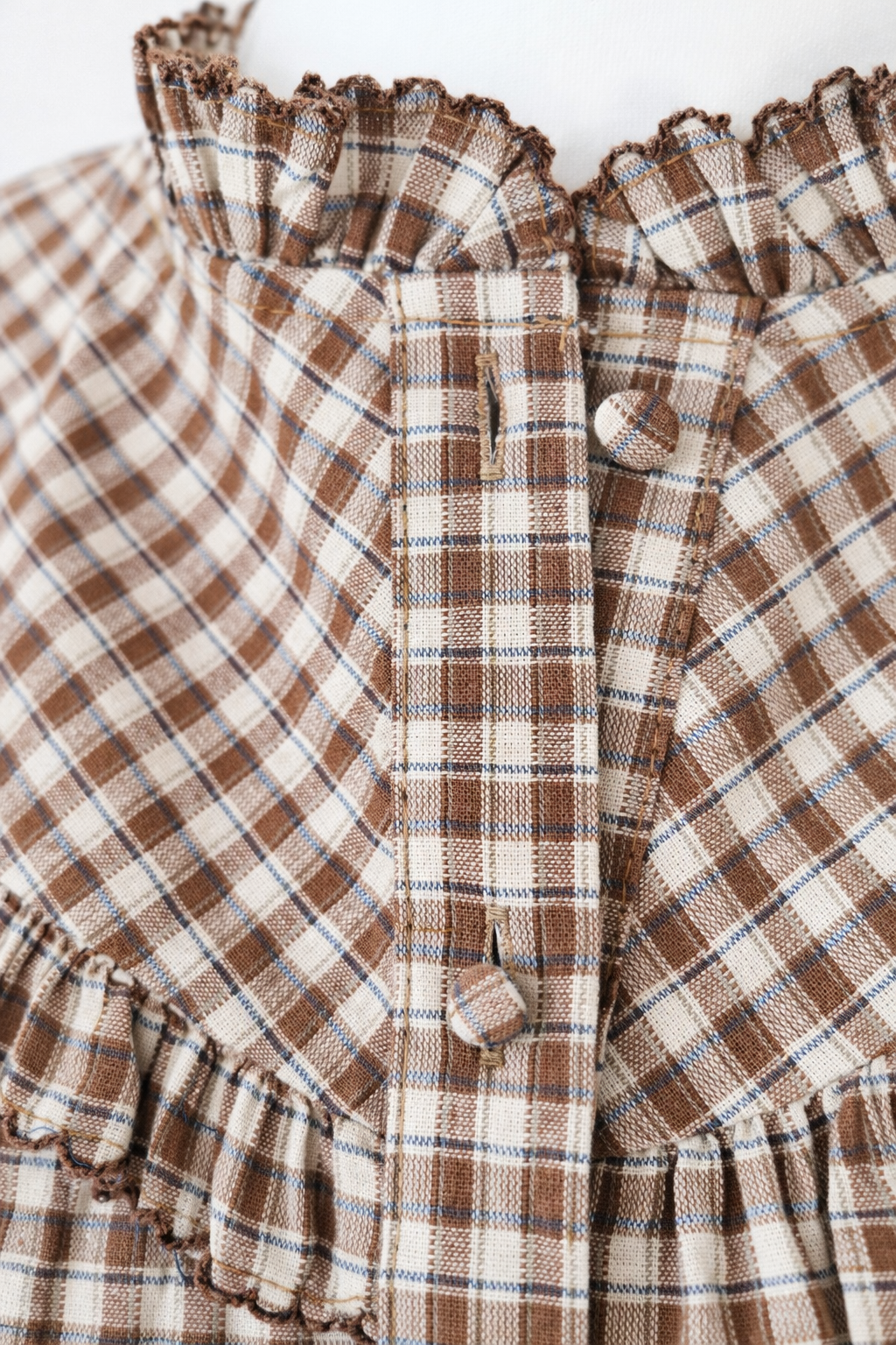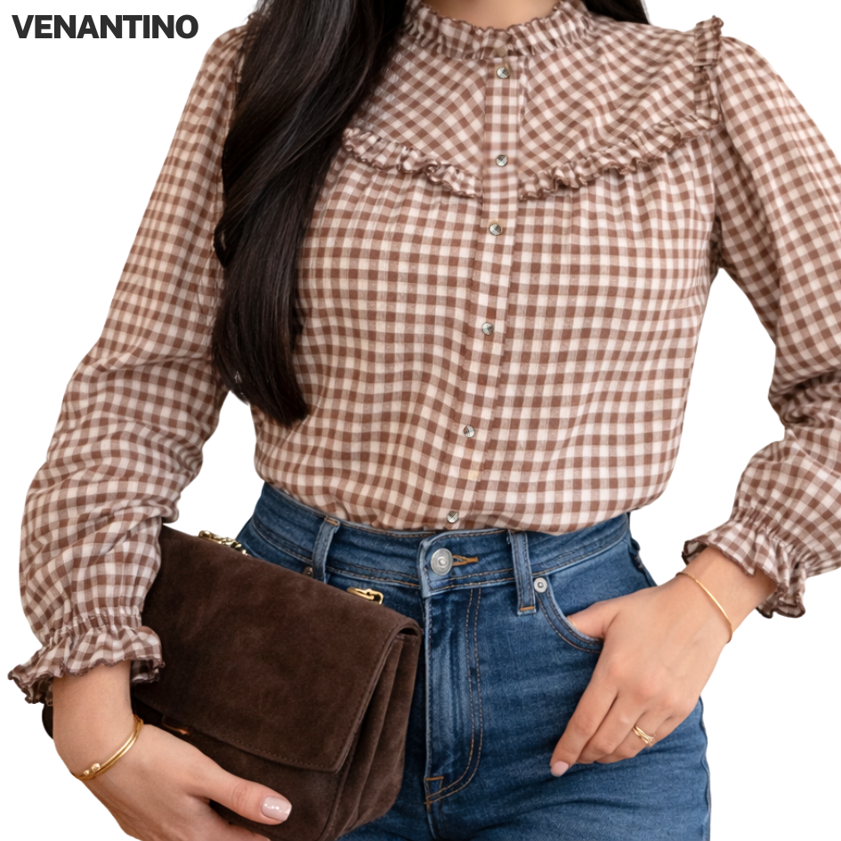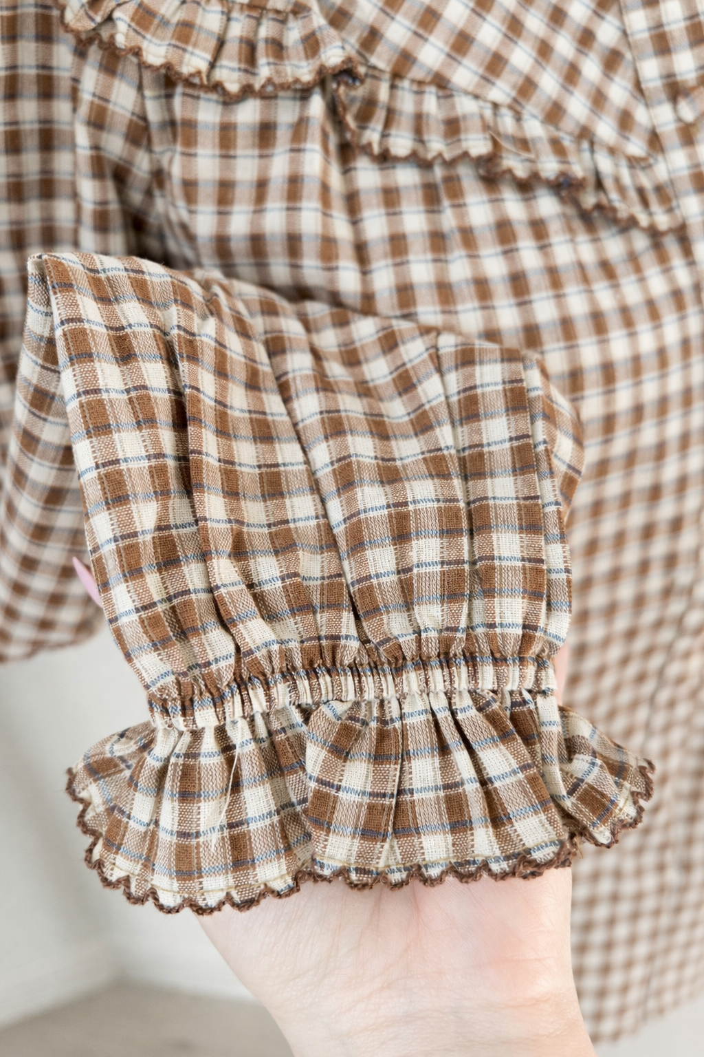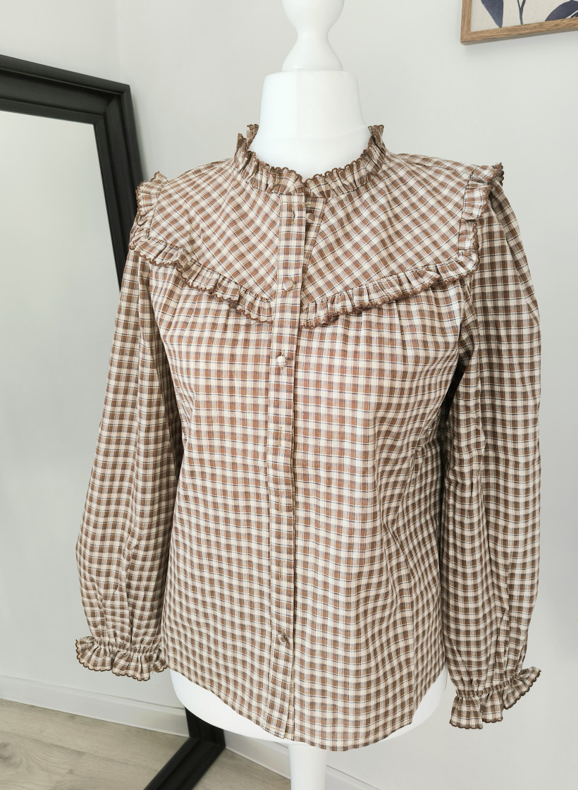 Drobna krateczka w ciepłym karmelowym odcieniu pięknie komponuje się z romantycznymi falbankami przy ramionach i dekolcie. Te drobne detale nadają koszuli lekko vintage’owy charakter, który wygląda niezwykle stylowo.