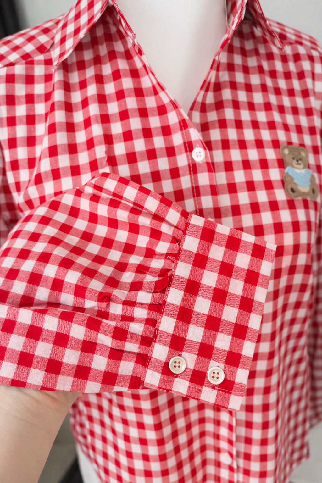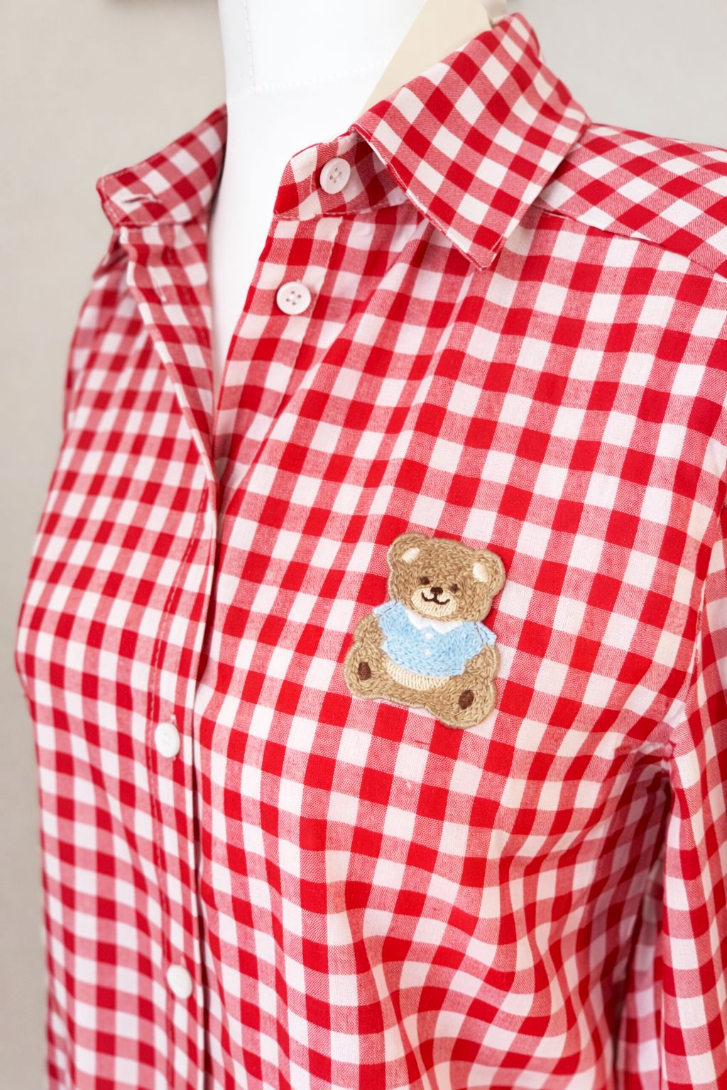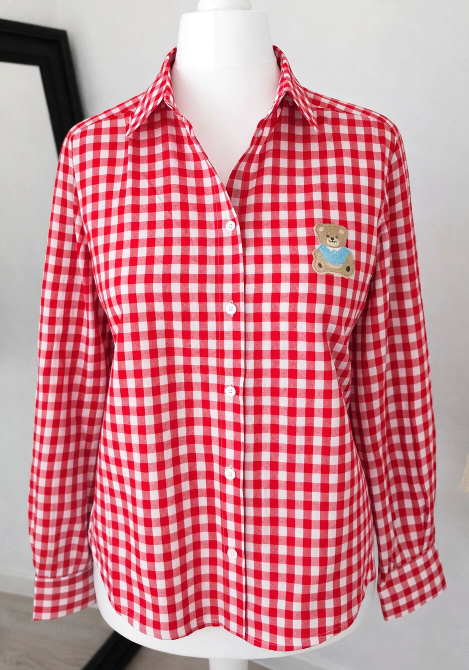 Klasyczna czerwono-biała krata, piękny kobiecy fason i urocza naszywka z małym misiem, która sprawia, że całość wygląda niezwykle stylowo, ale też lekko i dziewczęco.