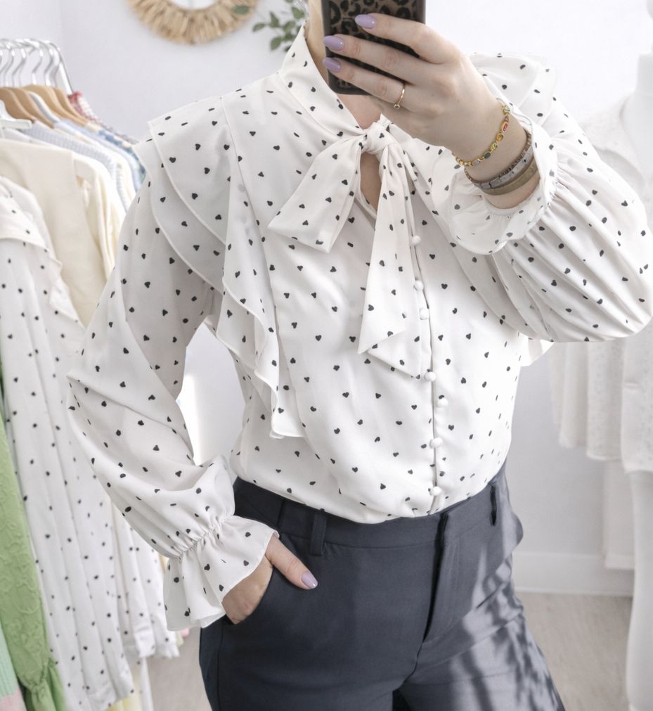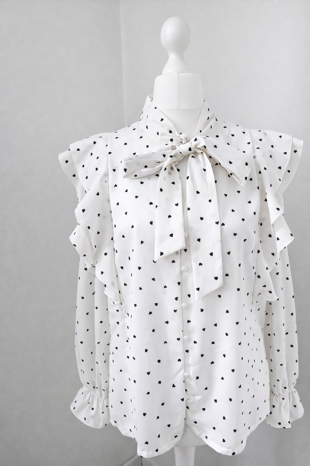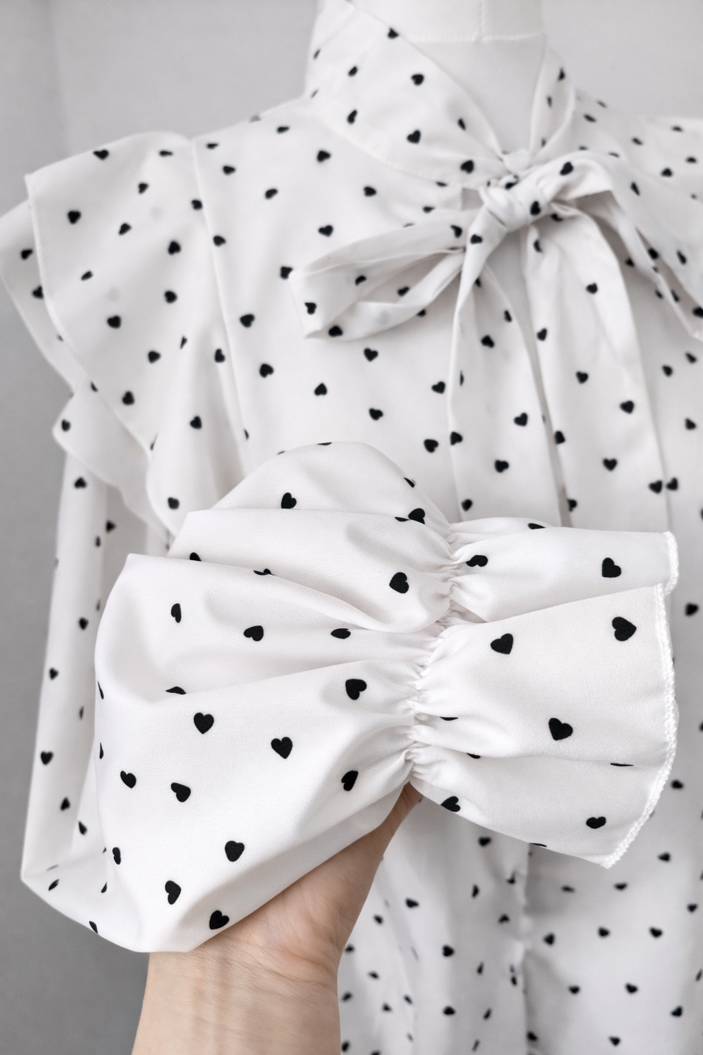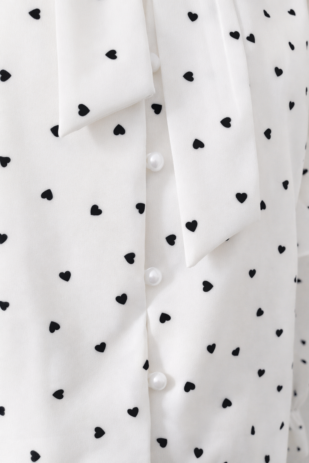 Delikatne czarne serduszka na jasnym tle nadają jej uroku, a efektowna kokarda przy szyi sprawia, że wygląda szykownie i wyjątkowo.