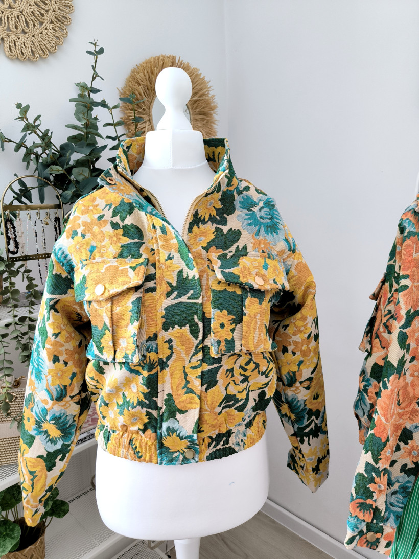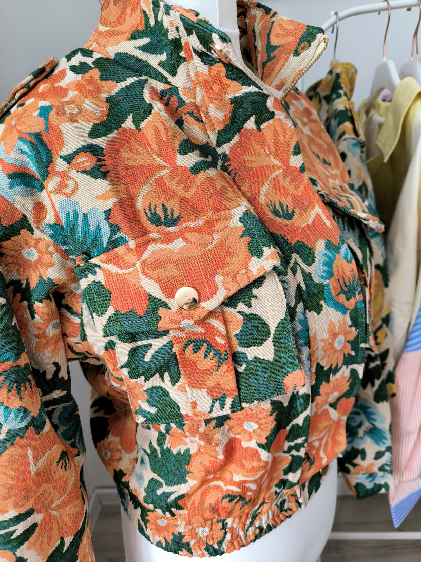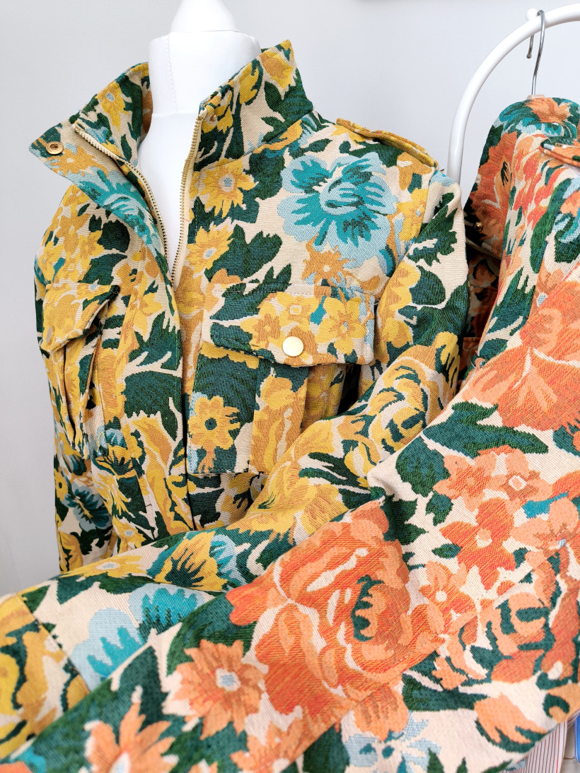 Gruby, strukturalny materiał o gobelinowym splocie + wyrazisty, kwiatowy wzór w energetycznych kolorach.