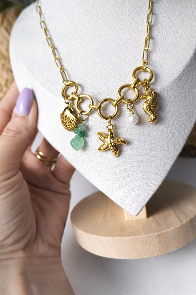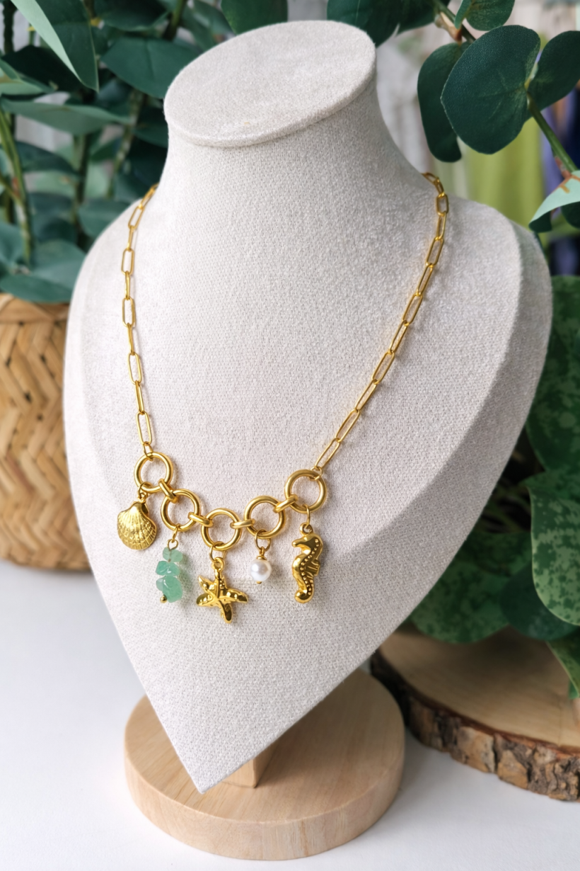 Złoty łańcuszek połączony efektownymi ogniwami tworzy mocną, wyrazistą bazę, a zawieszki w morskim klimacie nadają mu charakteru: