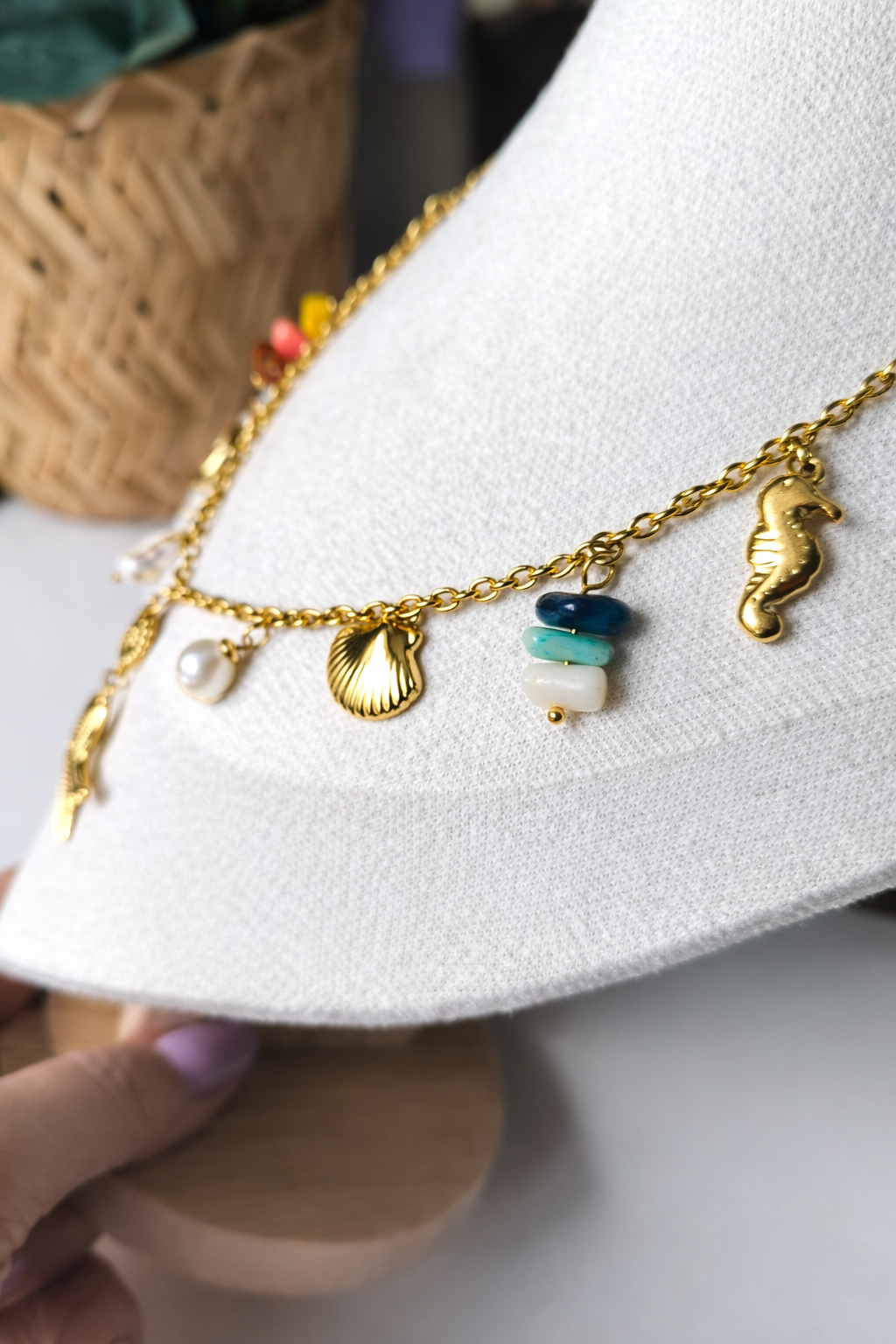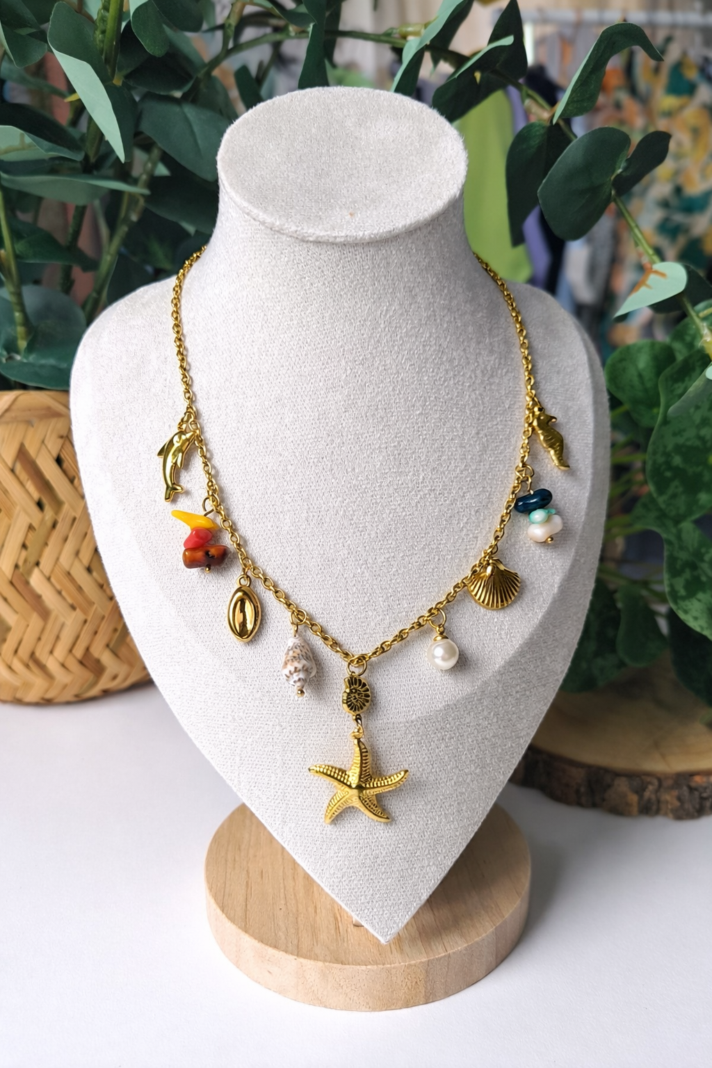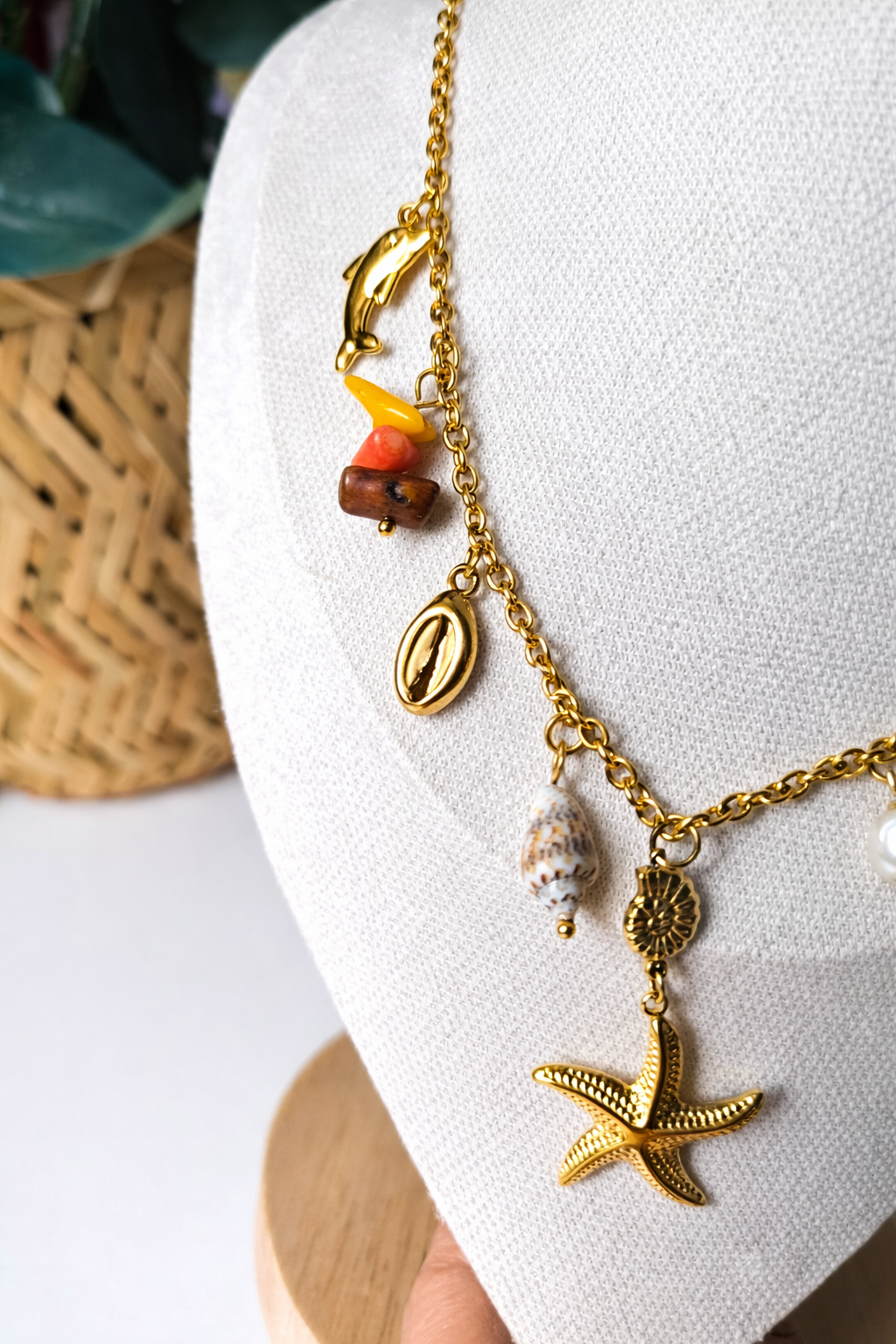 Stella Marina Capri to biżuteria, która wygląda jak pamiątka z włoskich wakacji. Złoty łańcuszek ozdobiony zawieszkami inspirowanymi morzem tworzy efektowną, ale lekką kompozycję pełną detali.